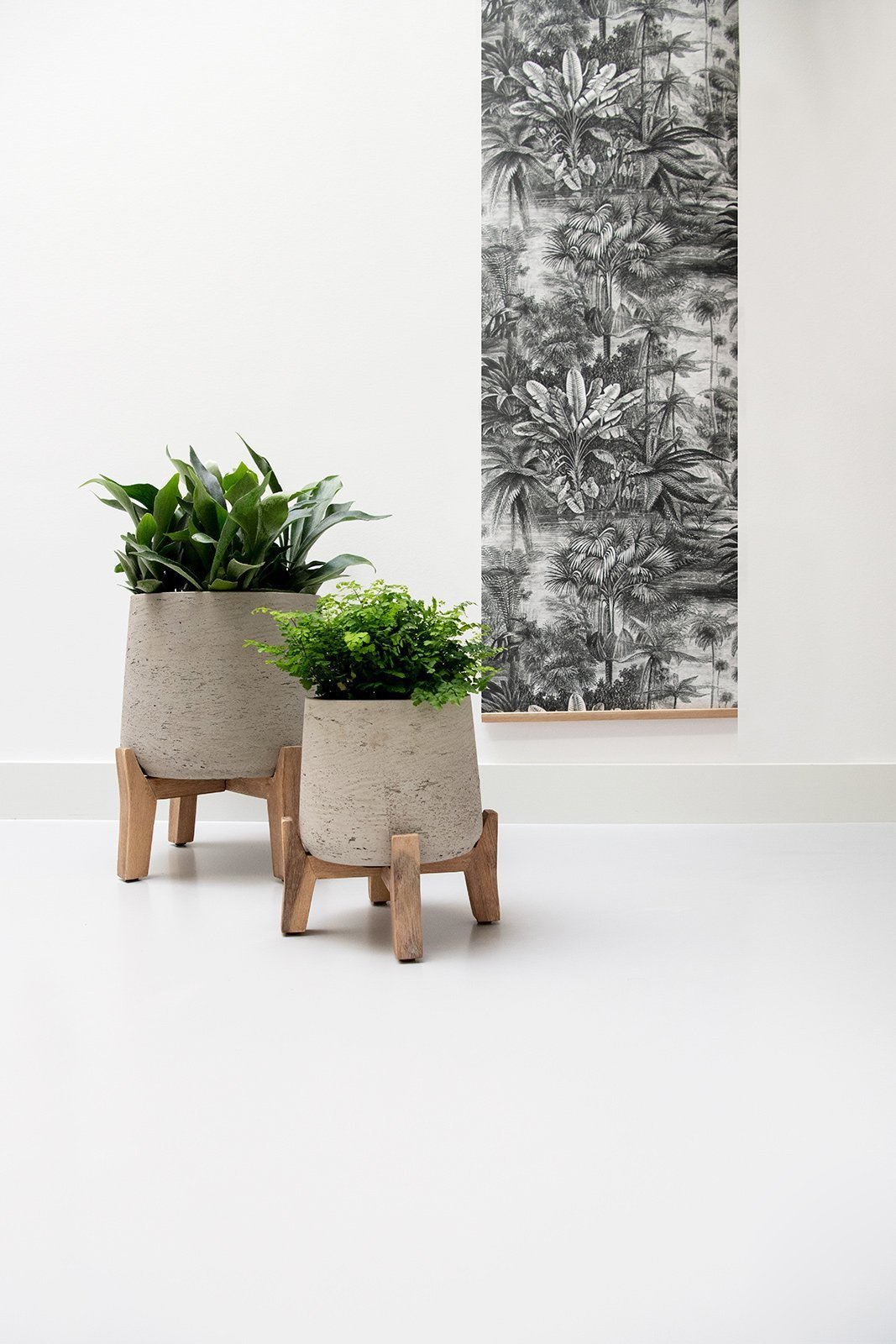 Naturalna donica na niskich drewnianych nóżkach Patt XXL wykonana jest ze zmielonego kamienia, piasku i cementu wzmocnionego włóknem szklanym. Dzięki temu jest odporna na warunki atmosferyczne (mrozoodporna) i można ją stosować we wnętrzach jak i na zewnątrz. Nóżki są wykonane z naturalnego drewna. Osłonka wyróżnia się nie tylko naturalnym wyglądem, ale również oryginalnym kształtem i świetnie sprawdzi się w otoczeniu zarówno nowoczesnym jak i klasycznym. W doniczce pięknie prezentują się rośliny żywe jak i kwiaty sztuczne.