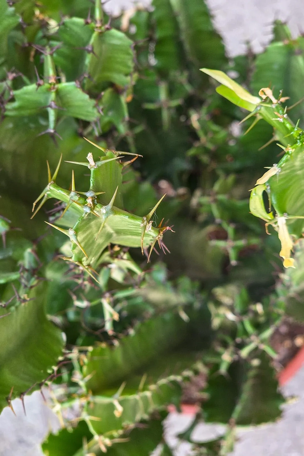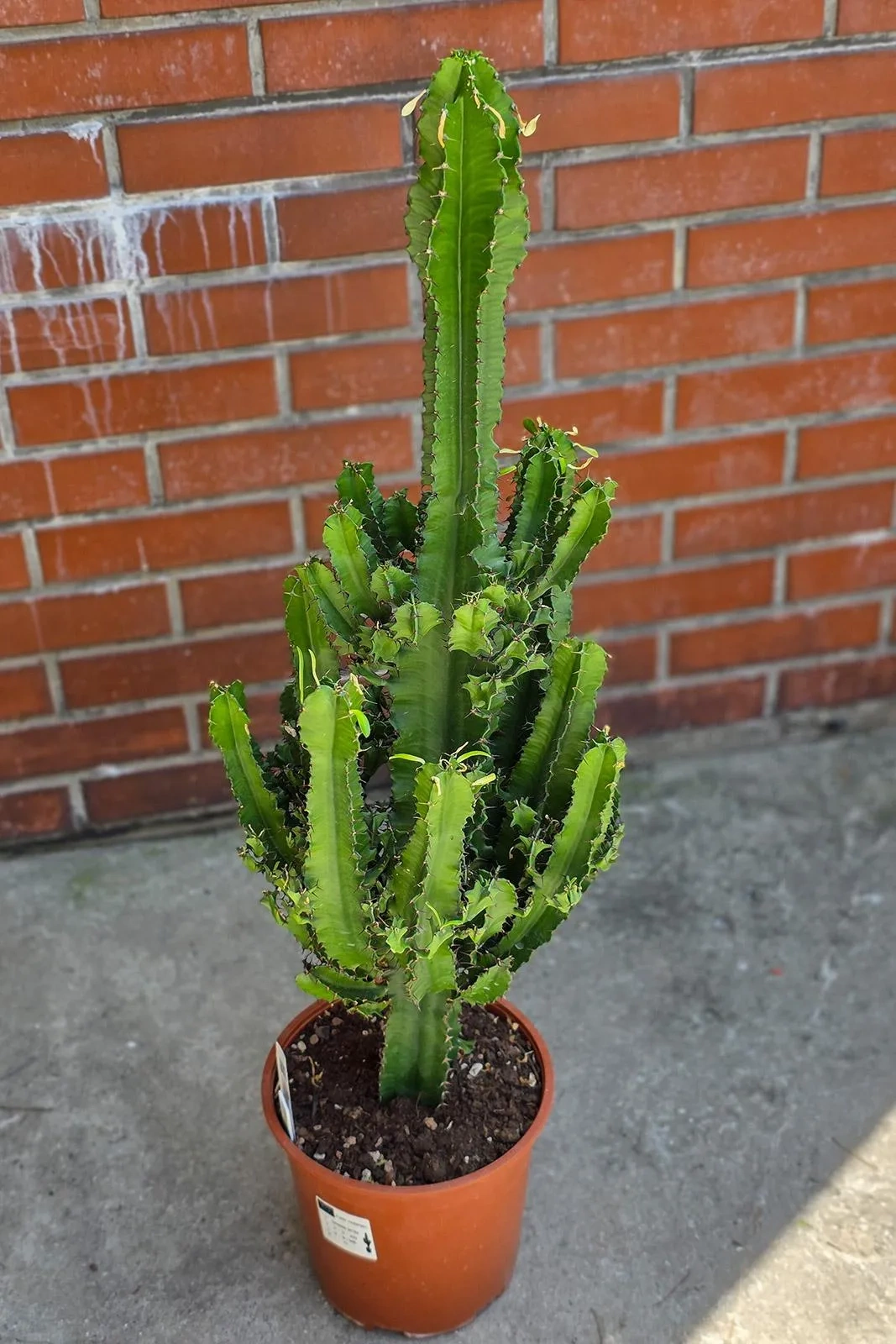 Kaktus Euphorbia erytrea charakteryzuje się grubym, mięsistym pniem oraz licznymi, rozgałęzionymi ramionami, które tworzą zjawiskową, drzewiastą formę. Intensywnie zielony kolor pędów, ozdobiony wyraźnymi, ciemnymi cierniami, nadaje roślinie surowego, a zarazem eleganckiego charakteru. Roślina jest doskonale przystosowana do przechowywania wody, co czyni ją niezwykle odporną na suszę i sprawia, że jest idealna nawet dla zapominalskich ogrodników.