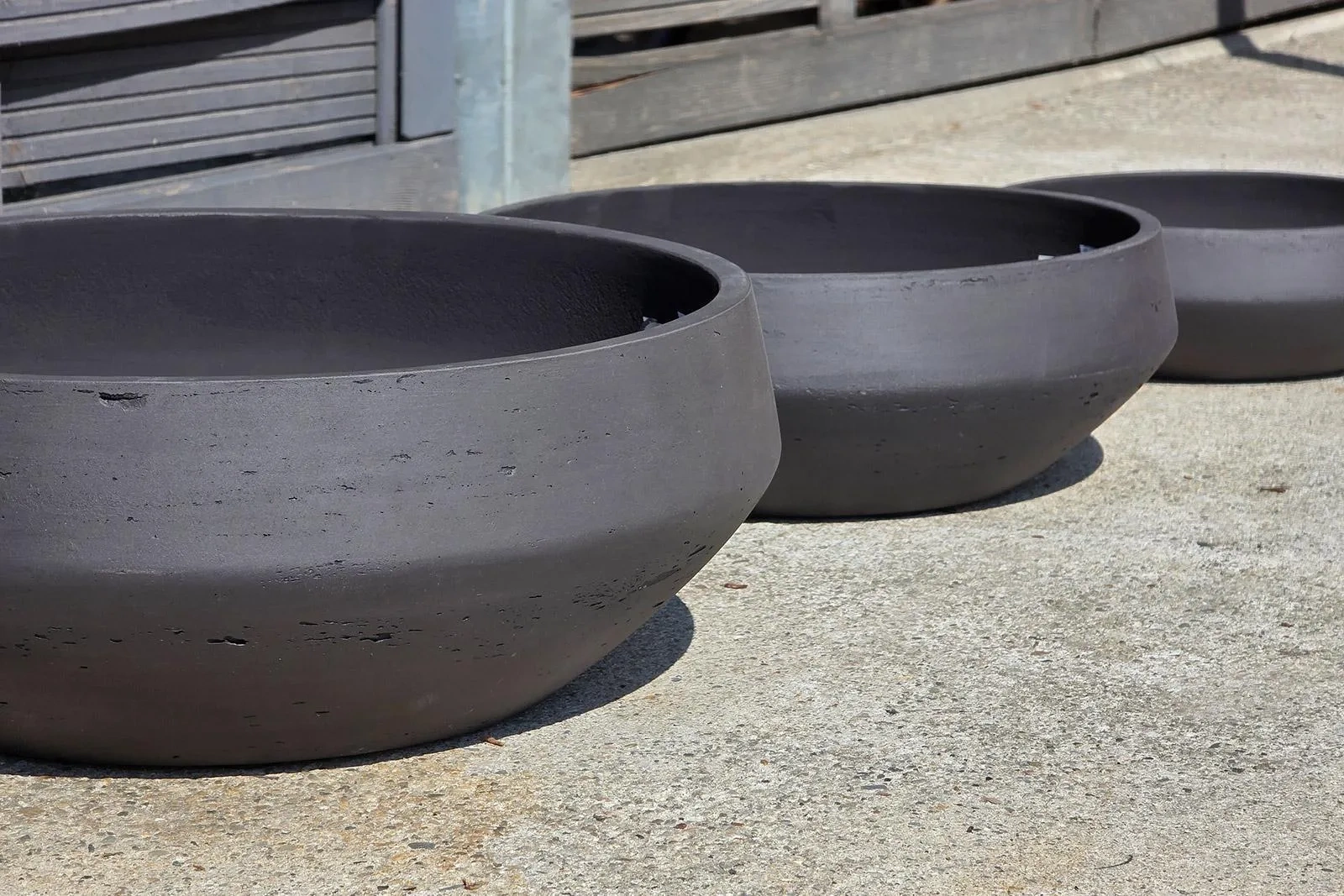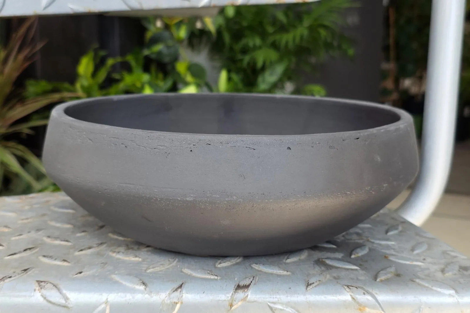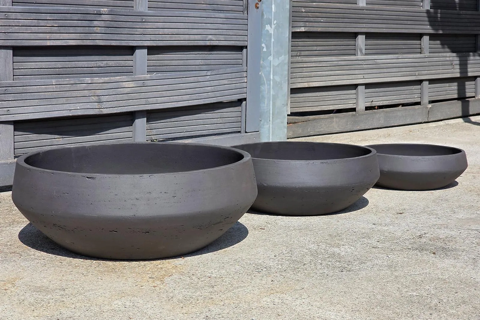 Misa Madu charakteryzuje się niskim, owalnym kształtem, który doskonale eksponuje zieleń roślin i tworzy stylowe kompozycje. Jej powierzchnia ma naturalną, porowatą strukturę z subtelnymi, jaśniejszymi przetarciami, które nadają jej surowy, kamienny wygląd. Kolor antracytowy to głęboka, matowa czerń, która wprowadza do przestrzeni poczucie nowoczesności i elegancji.