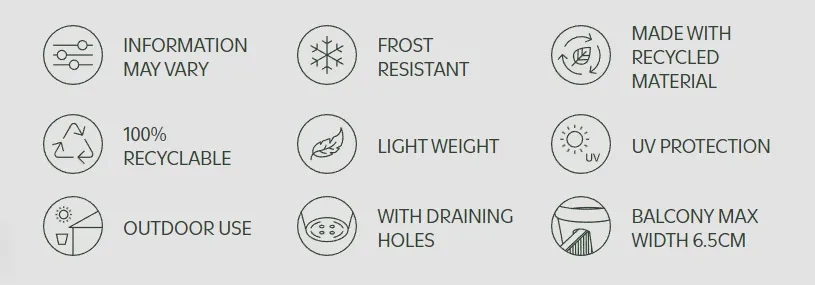 Na wiele lat! - doniczki nakładane na balustradę Venezia Balcony są mrozoodporne i nie zmieniają koloru pod wpływem promieniowania UV. Wyprodukowane z materiałów pochodzących z recyklingu i w 100% nadają się do recyklingu.