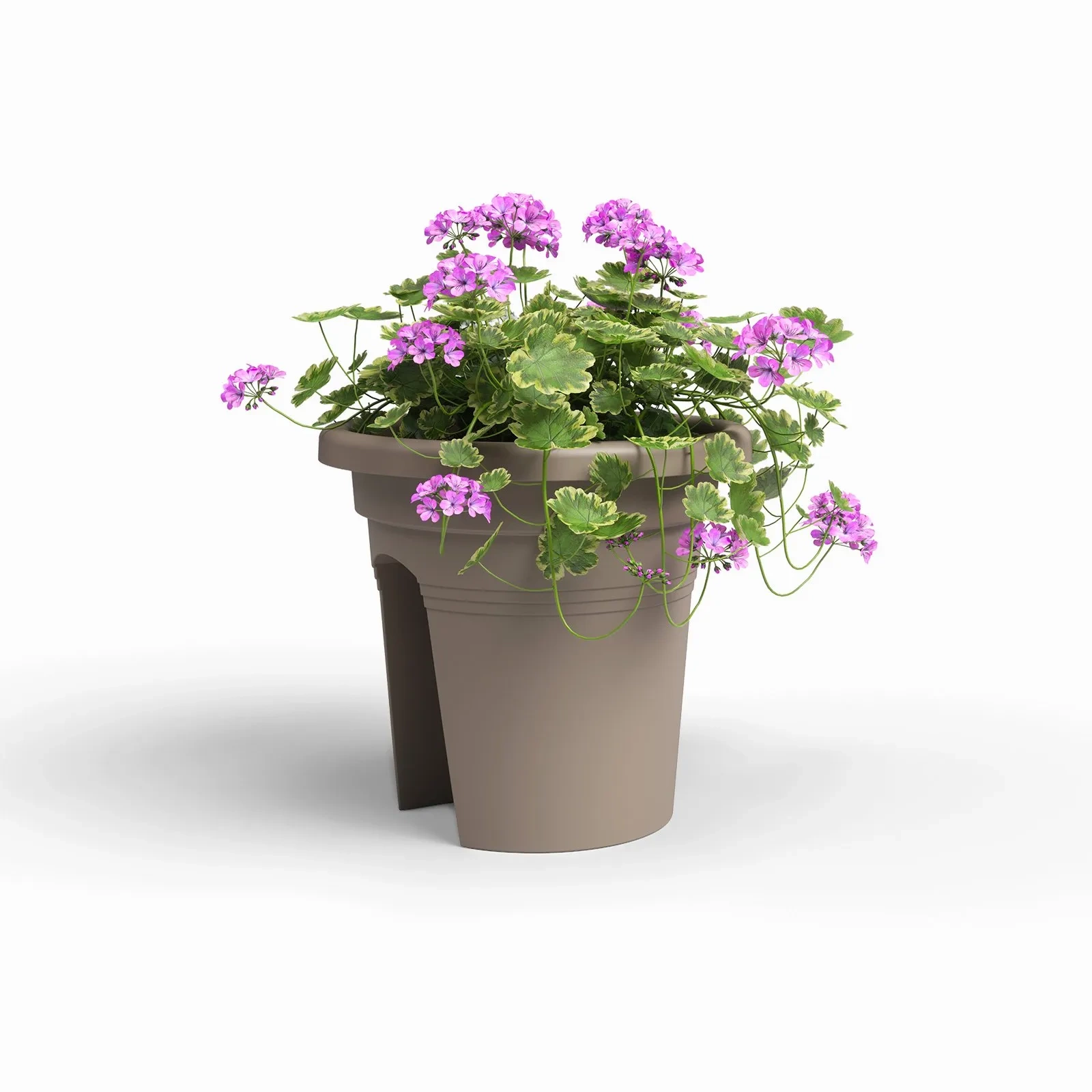 Łatwa do nałożenia na balustradę doniczka Venezia Balcony 30 cm w kolorze taupe wraz z roślinami ozdobi Twój balkon i taras. Lekka forma doniczki idealnie komponuje się z kwiatami.