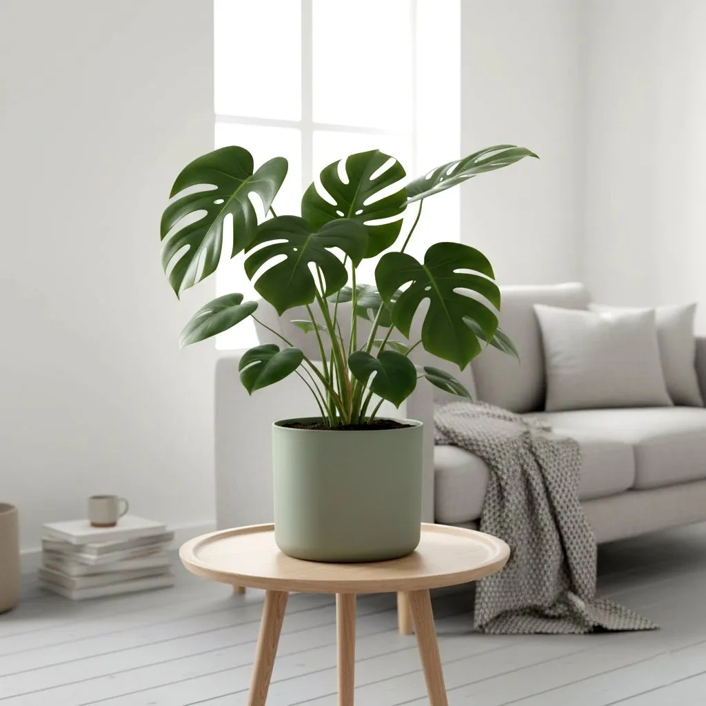 - Harmonia kolorów w salonie: połącz kolor Stone Green z innymi naturalnymi barwami: drewnem, bielą ścian i beżowymi tekstyliami. Osłonka pięknie wyeksponuje rośliny o dużych, ciemnozielonych liściach (np. filodendron, kalatea).