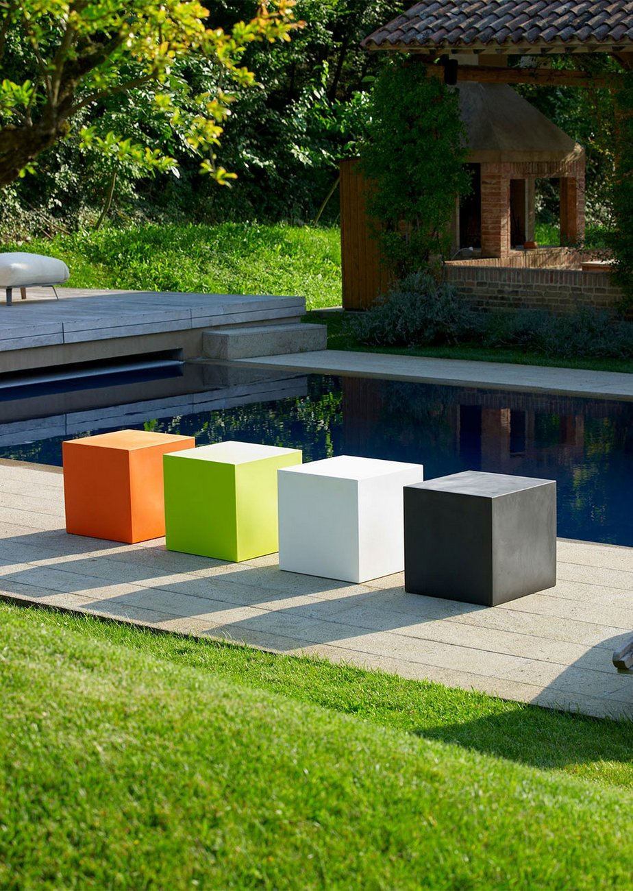 Kolorowe stoliki KUBE. Wykonane z tworzywa sztucznego. Stoliki są mrozoodporne i odporne na działanie promieni UV (nie zmieniają koloru).