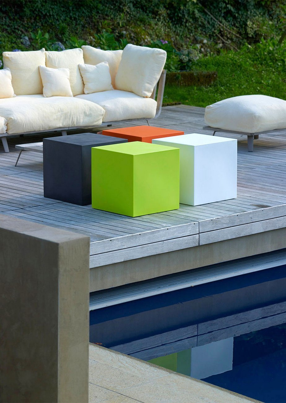 Kolorowe stoliki KUBE. Wykonane z tworzywa sztucznego. Stoliki są mrozoodporne i odporne na działanie promieni UV (nie zmieniają koloru).