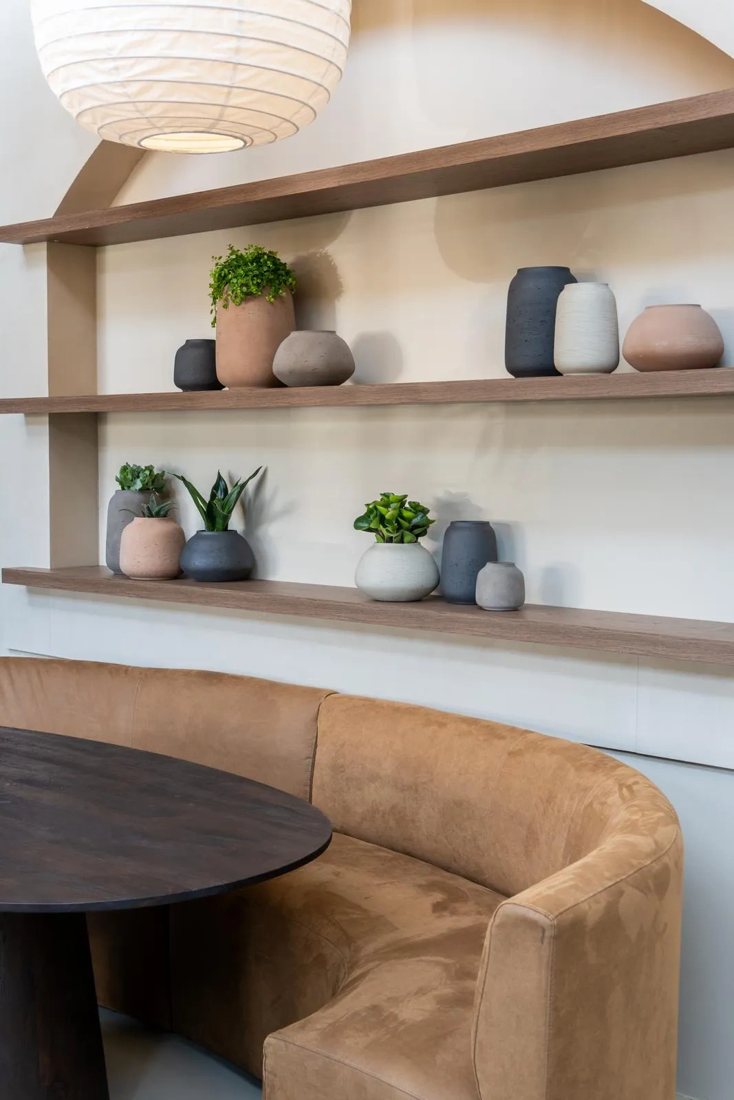 • Styl Japandi: połączenie minimalizmu, funkcjonalności i naturalnych materiałów. Postaw wazon na drewnianej komodzie obok ceramicznej misy i delikatnej rośliny, np. gałązek eukaliptusa.