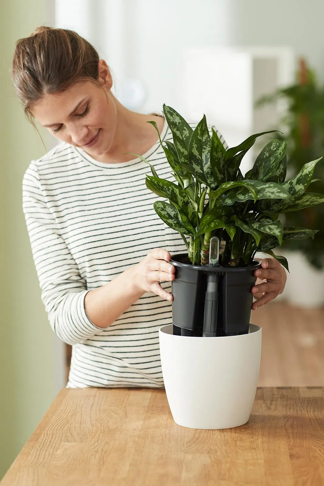 To prosty uniwersalny system nawadniania, który zapewnia, że roślina otrzymuje odpowiednią ilość wody dokładnie we właściwym czasie. Wskaźnik poziomu wody wskazuje, kiedy należy ją podlać, a roślina będzie sama o siebie dbać przez dłuższy czas.