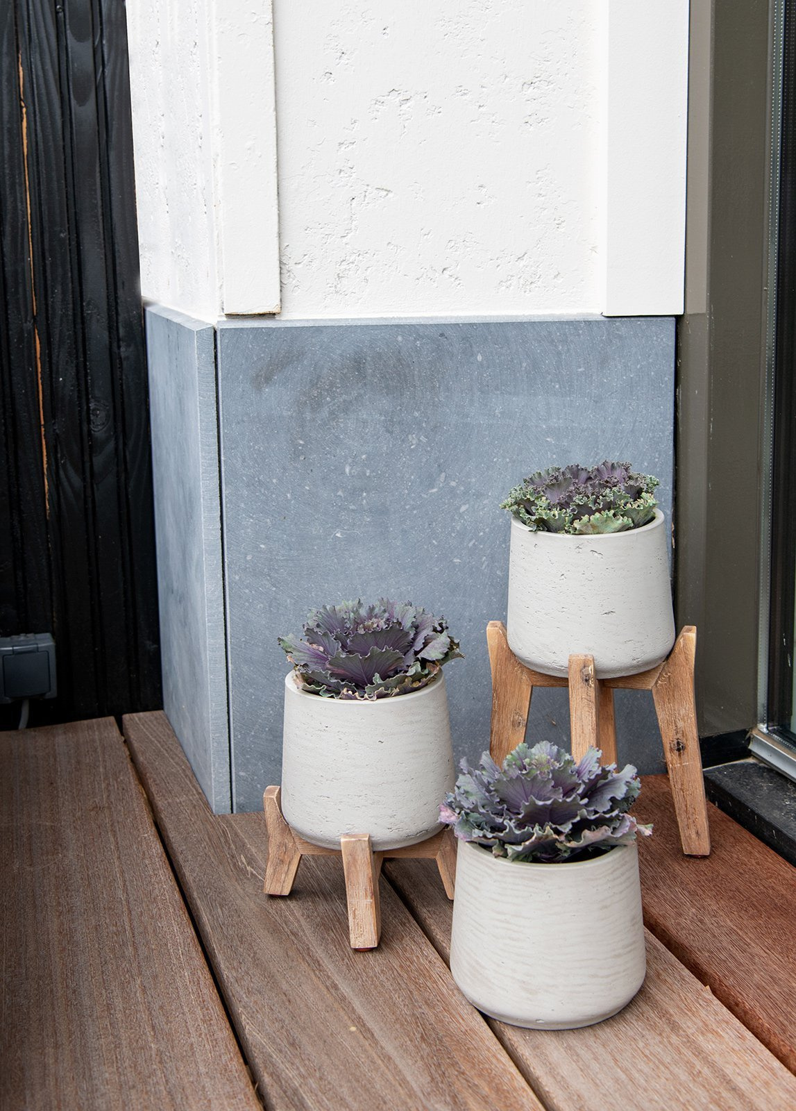 Naturalna donica na wysokich drewnianych nóżkach Patt XXL wykonana jest ze zmielonego kamienia, piasku i cementu wzmocnionego włóknem szklanym. Dzięki temu jest odporna na warunki atmosferyczne (mrozoodporna) i można ją stosować we wnętrzach jak i na zewnątrz. Nóżki są wykonane z naturalnego drewna. Osłonka wyróżnia się nie tylko naturalnym wyglądem, ale również oryginalnym kształtem i świetnie sprawdzi się w otoczeniu zarówno nowoczesnym jak i klasycznym. W doniczce pięknie prezentują się rośliny żywe jak i kwiaty sztuczne.