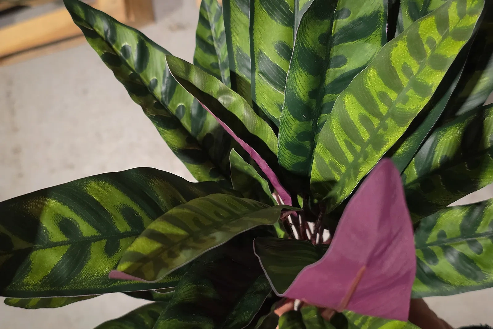 - realistyczny wzór liści: liście charakteryzują się autentycznym, dwukolorowym wzorem, typowym dla odmiany 'Peacock' (Pawiej). Góra liścia: jasnozielona blaszka z wyraźnymi, ciemnozielonymi plamami układającymi się wzdłuż nerwów, przypominającymi pióra pawia lub wzór wężowej skóry. Spód liścia: intensywnie purpurowo-czerwony lub burgundowy, co dodaje roślinie głębi i kontrastu.