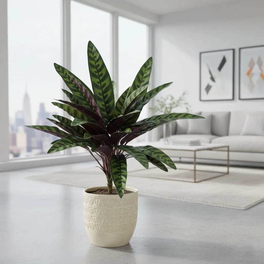 Dzięki swoim niewielkim wymiarom i egzotycznemu wyglądowi, sztuczna Kalatea Peacock znajdzie swoje miejsce w wielu wnętrzach: