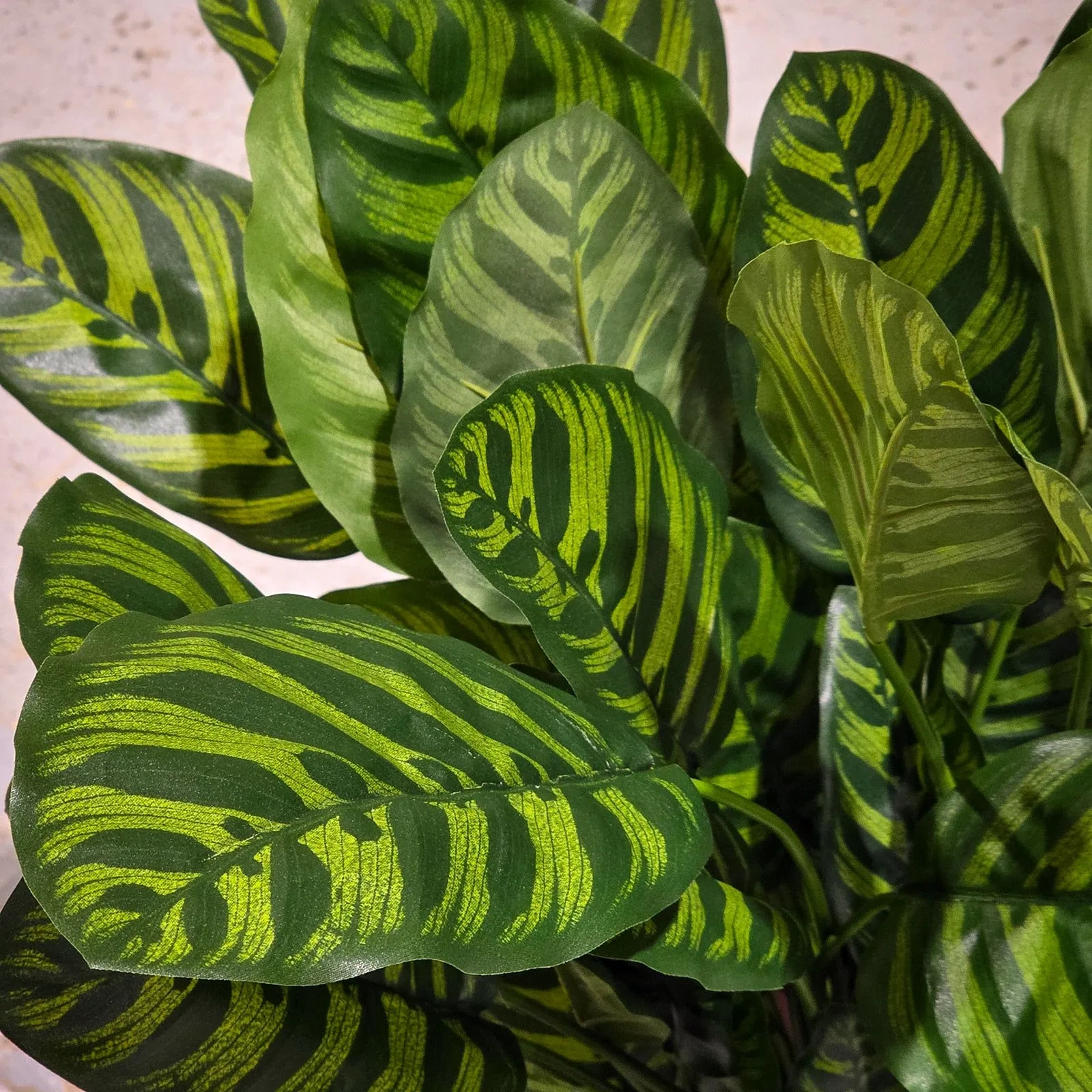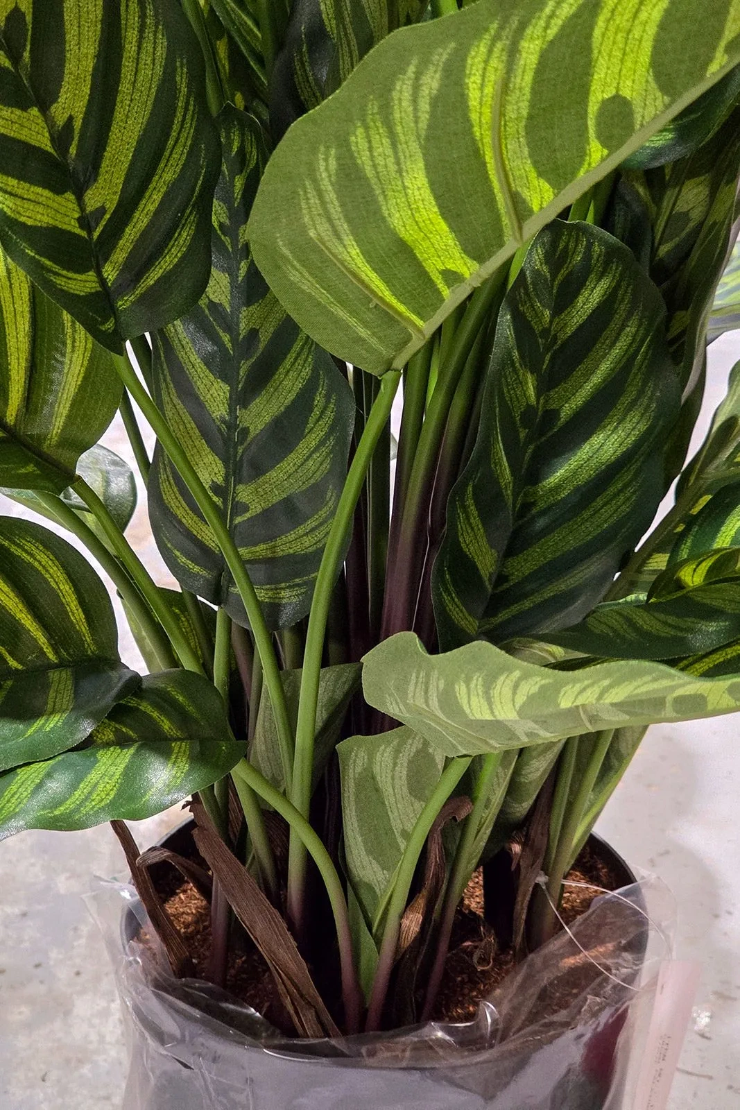 - intensywny wzór liści: liście posiadają charakterystyczny, zeberkowaty/pierzasty wzór (w stylu odmian zebrina lub makoyana). Kontrastowe pasy w odcieniach limonkowej zieleni i ciemnej zieleni gwarantują realistyczny wygląd i bogatą teksturę wizualną. Jest to bardzo atrakcyjny, graficzny wzór, który natychmiast przyciąga wzrok.