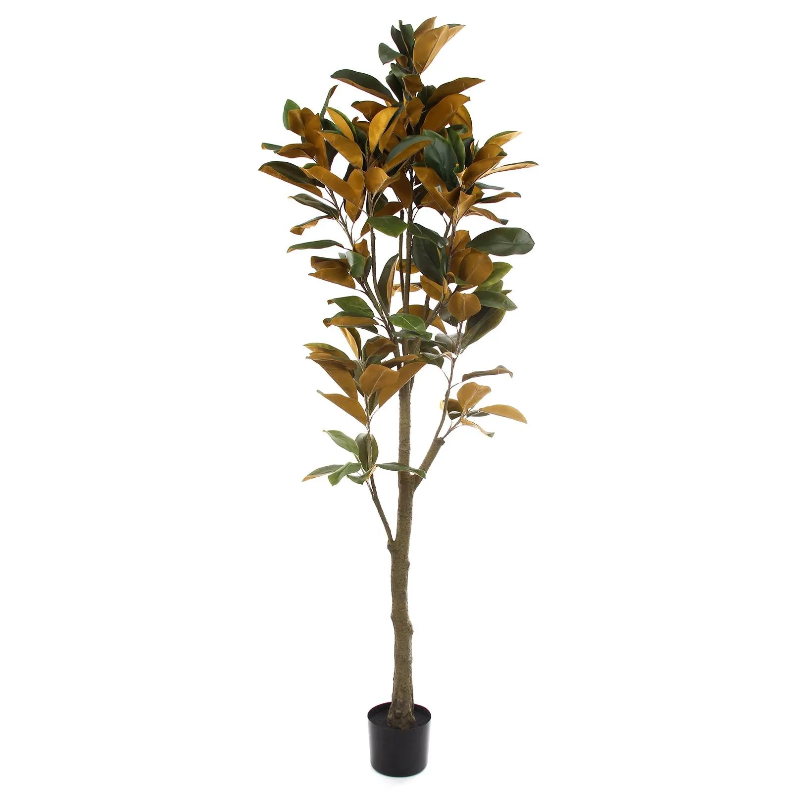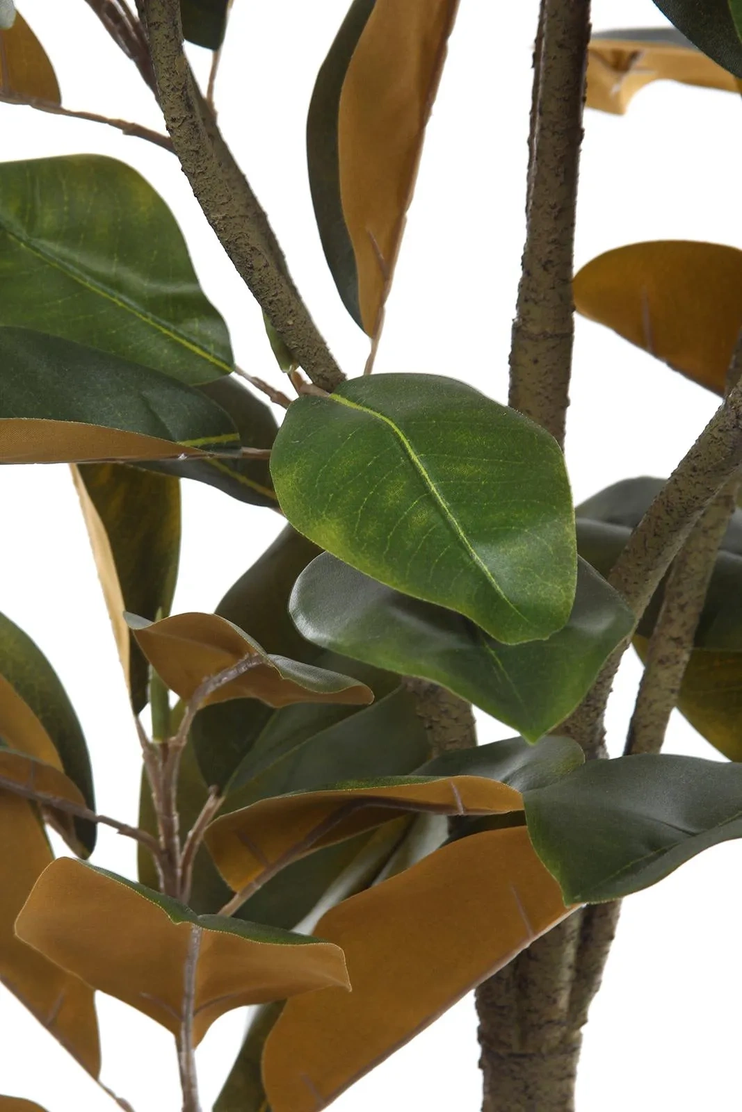 Sztuczna Magnolia Denudata o wysokości 180 cm to imponująca replika naturalnej magnolii, która zachwyca realistycznym wyglądem. Pień i gałęzie imitują naturalną korę drzewa, a liście są dwubarwne – intensywnie zielone od góry i brązowo-miedziane od spodu, co doskonale oddaje wygląd liści magnolii. Liście są gęsto osadzone, tworząc bujną, naturalnie wyglądającą koronę. Roślina osadzona jest w stabilnej, prostej czarnej doniczce, gotowej do umieszczenia w większej, ozdobnej osłonce. Dzięki wysokości 180 cm, magnolia ta stanowi wyrazisty element dekoracyjny.