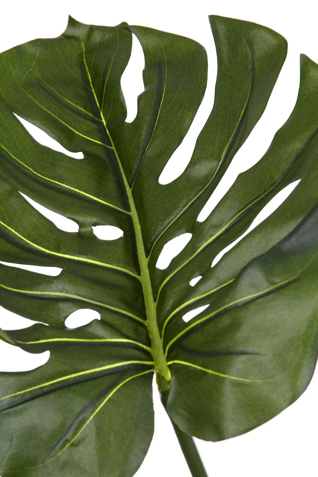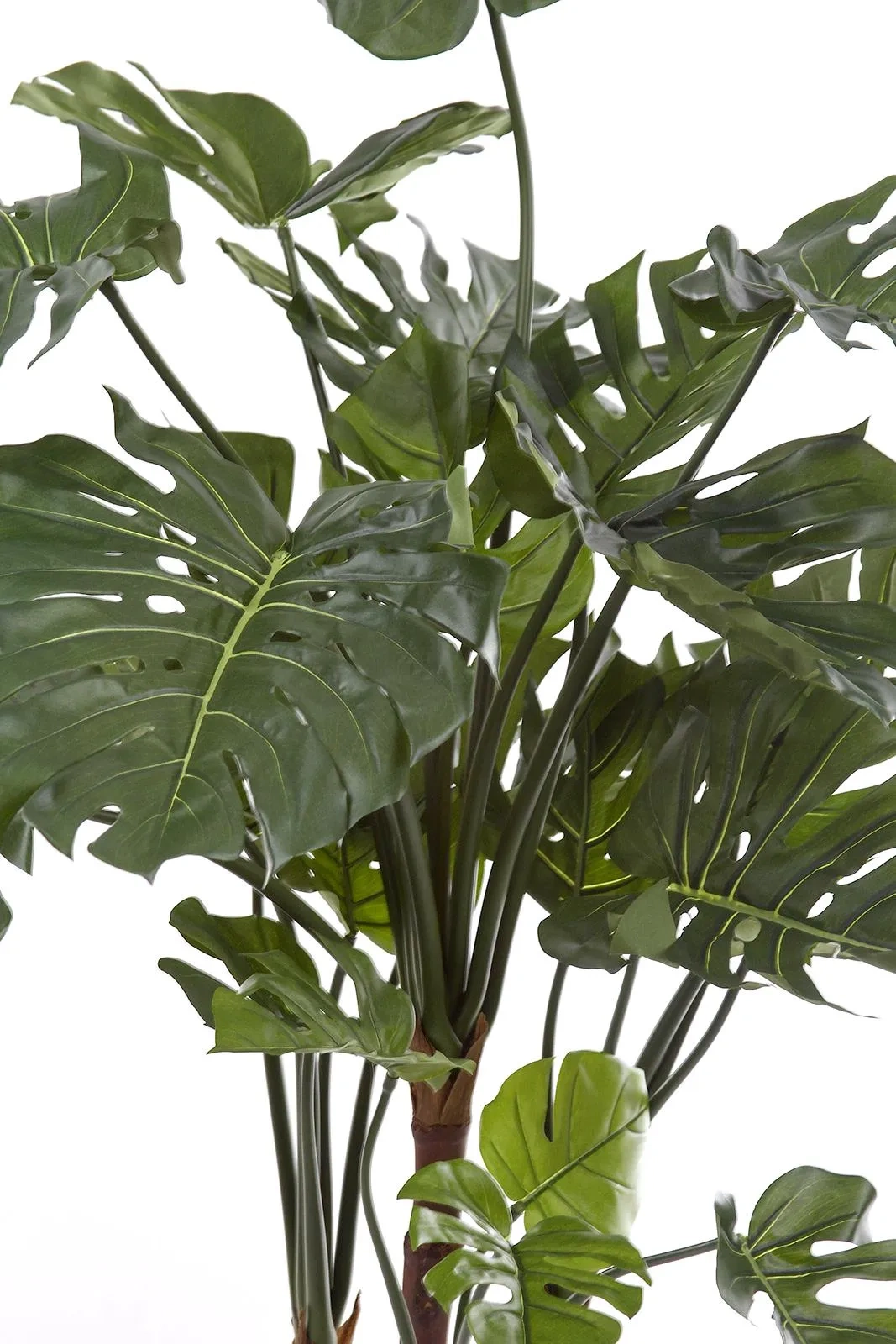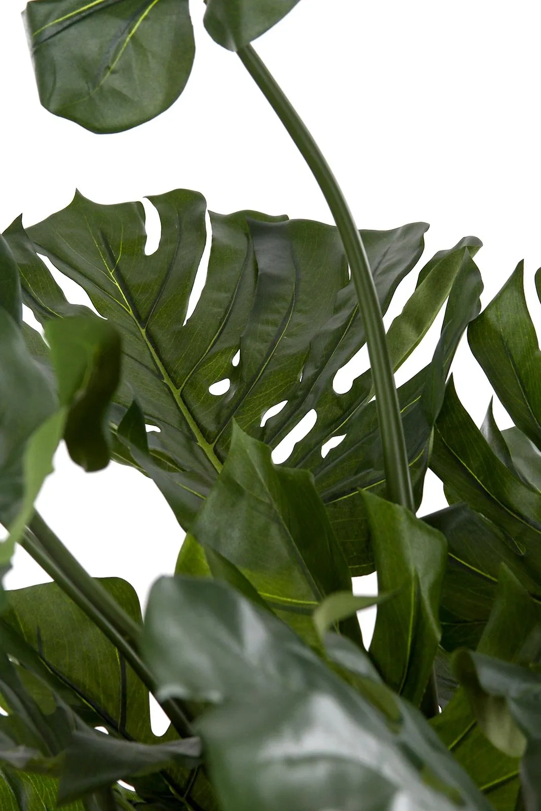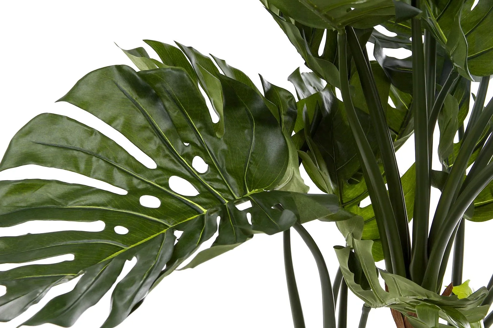Monstera została zaprojektowana z myślą o najwyższej jakości i naturalnym wyglądzie. To, co ją wyróżnia, to przede wszystkim naturalne, drewniane pnie, które dodają autentyczności roślinie. Liście o charakterystycznych wcięciach, typowych dla Monstera Deliciosa, mają głęboki, lśniący kolor i są wykonane z materiału, który idealnie odwzorowuje ich fakturę. Dodatkowo, starannie wyprofilowane pędy i liście sprawiają, że roślina wygląda bardzo naturalnie, a jej cała sylwetka jest gęsta i rozłożysta. Nawet z bliska trudno odróżnić ją od prawdziwej rośliny.