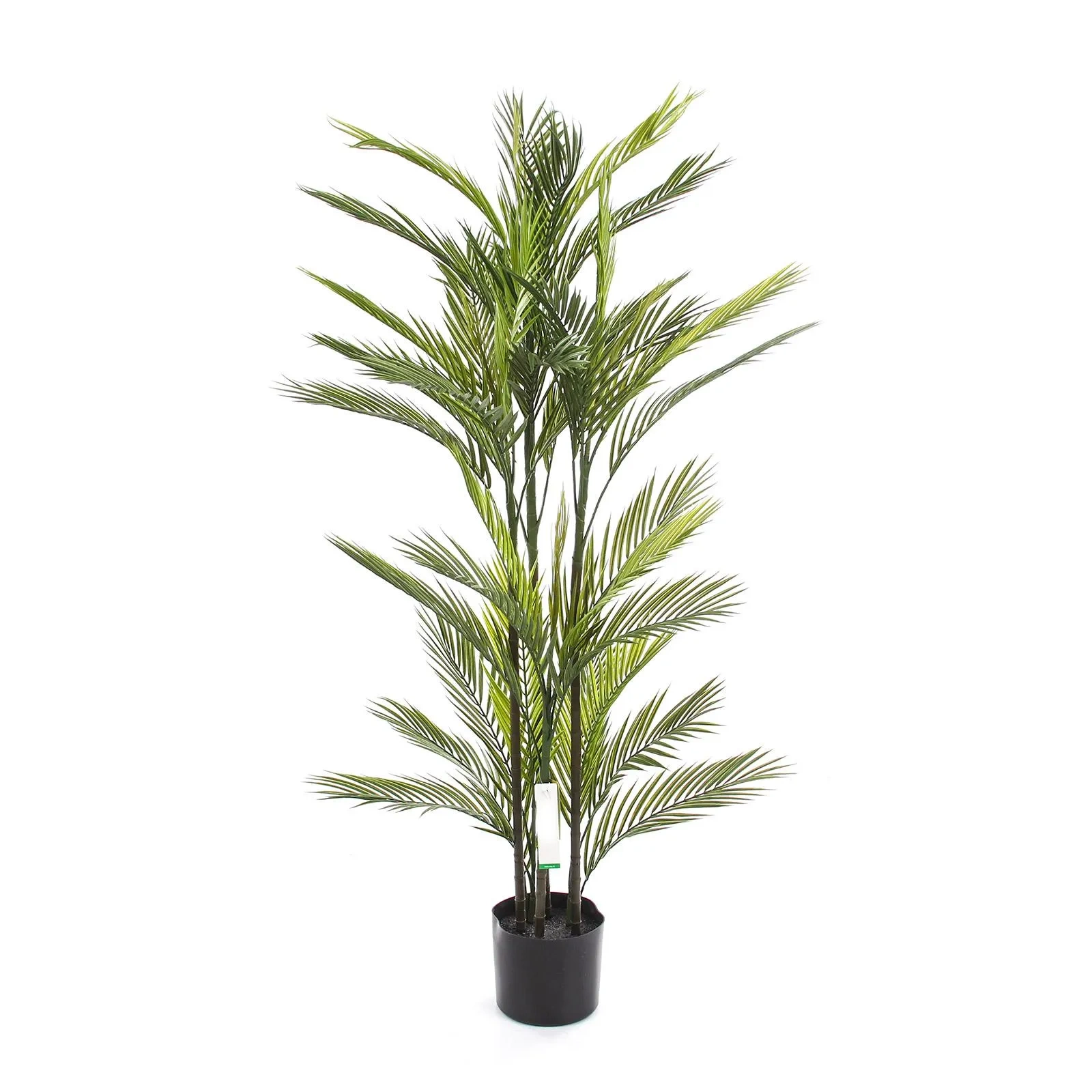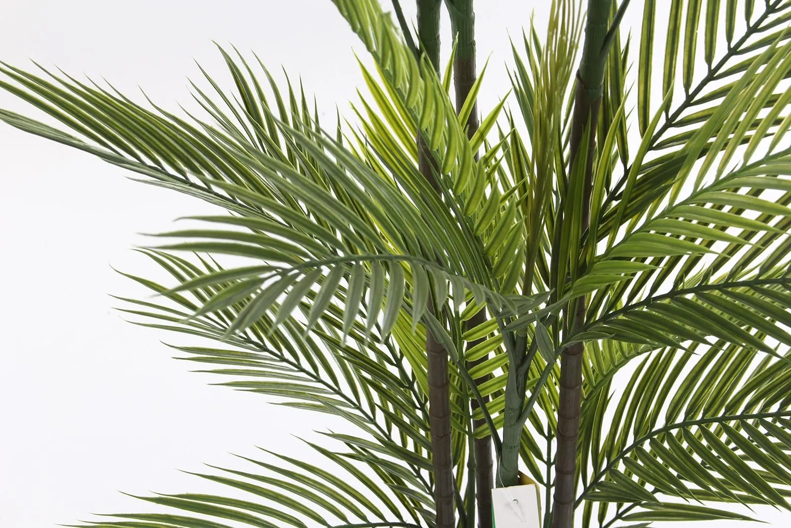 Nasza palma 140 cm zachwyca dbałością o detale, które wiernie oddają piękno prawdziwych palm. Gęste, pierzaste liście w odcieniach intensywnej zieleni, widoczne na zbliżeniach, prezentują się niezwykle naturalnie. Ich struktura i wybarwienie idealnie imitują żywą roślinę, dodając autentyczności każdej aranżacji. Palma składa się z kilku pni, co nadaje jej objętości i bujności, naśladując naturalny rozrost krzewiastej palmy. Roślina jest osadzona w stabilnej, czarnej donicy, gotowej do umieszczenia w dekoracyjnej osłonce, dopasowanej do Twojego stylu.