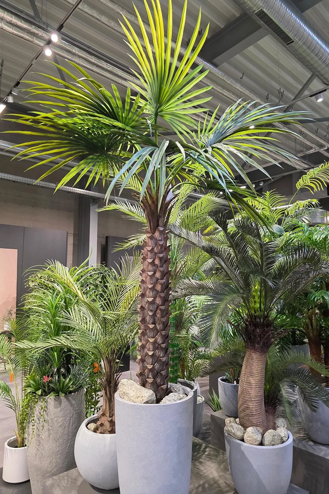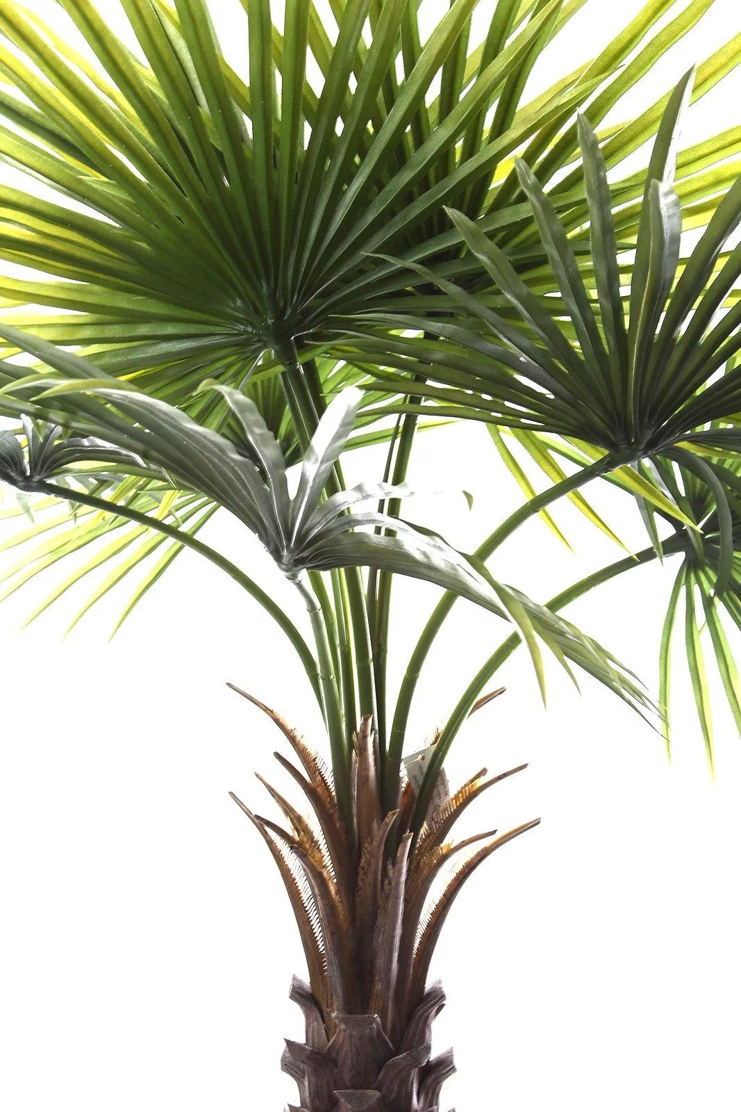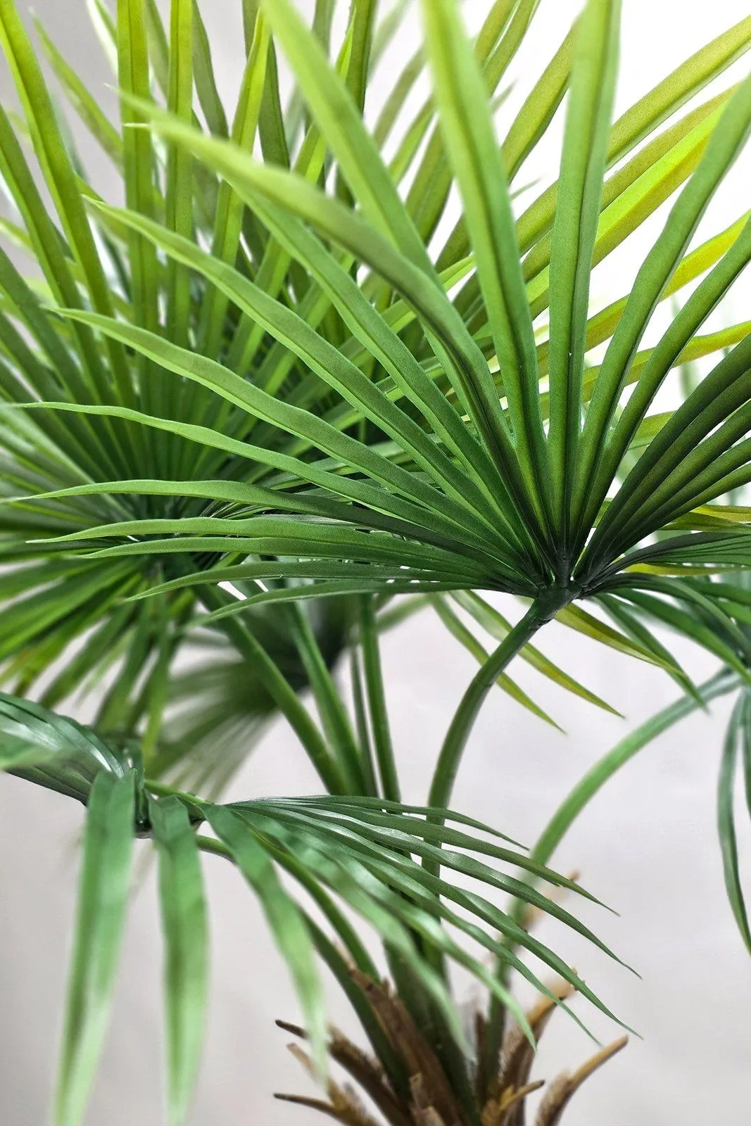 Sztuczna Palma Fan prezentuje się jako strzelista, elegancka roślina z charakterystycznym, grubym pniem. Pień jest realistycznie teksturowany, imitując naturalną powierzchnię palmy, z widocznymi "resztkami" starych liści, co nadaje mu autentyczności i dojrzałego wyglądu. Z jego szczytu rozpościera się dziewięć dużych, rozłożystych liści w kształcie wachlarza (stąd nazwa "Fan"). Liście są w odcieniach soczystej zieleni, z delikatnymi przejściami tonalnymi, które dodają im naturalności. Każdy liść jest misternie zaprojektowany z wyraźnymi segmentami i delikatnie postrzępionymi krawędziami, co wiernie naśladuje naturalne liście palmy. .