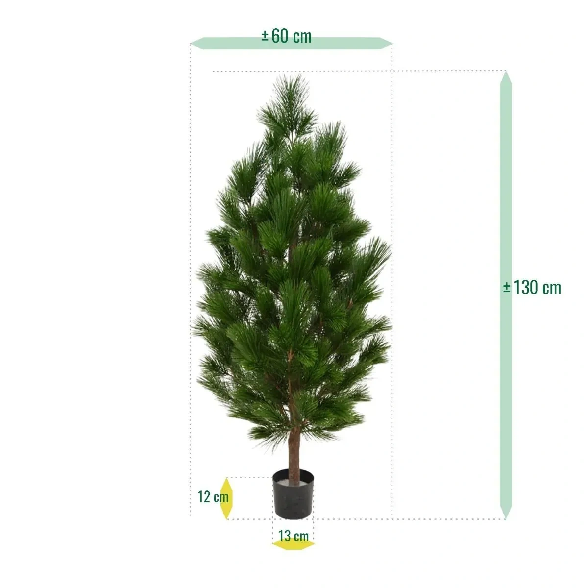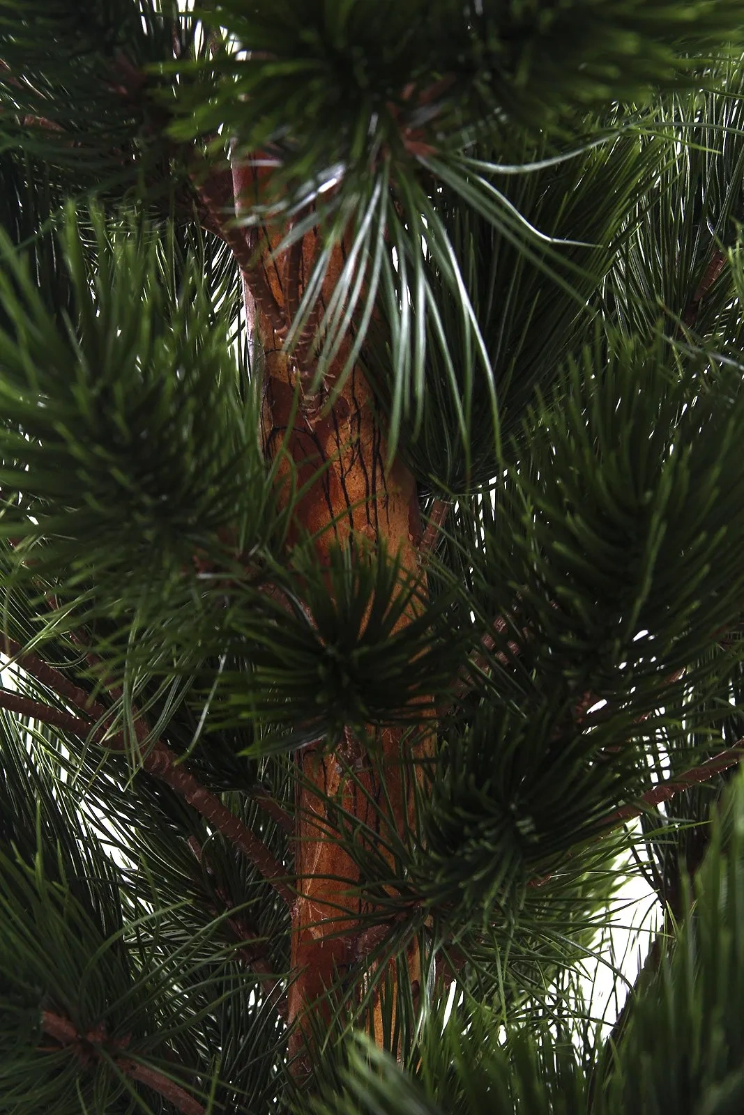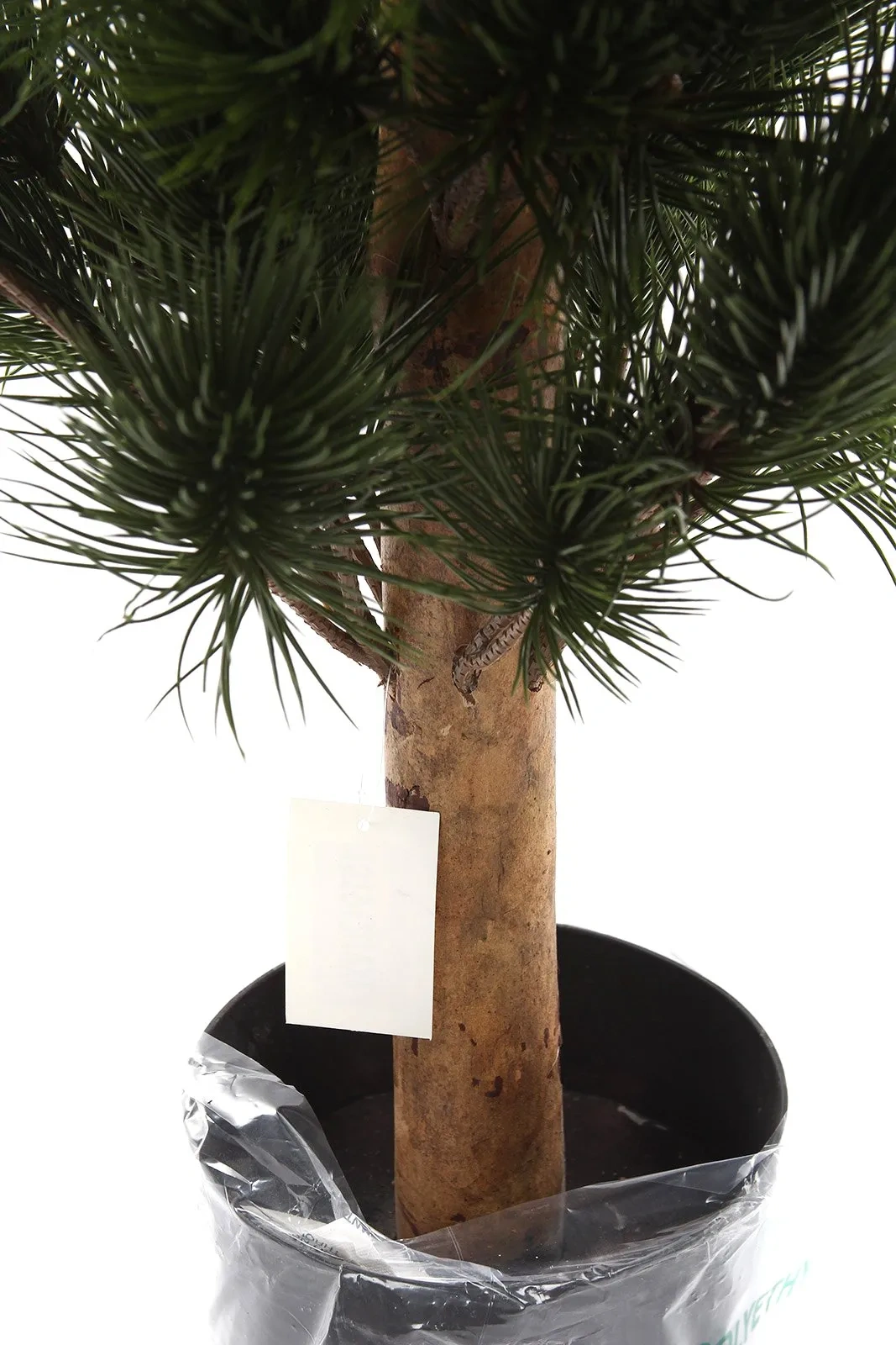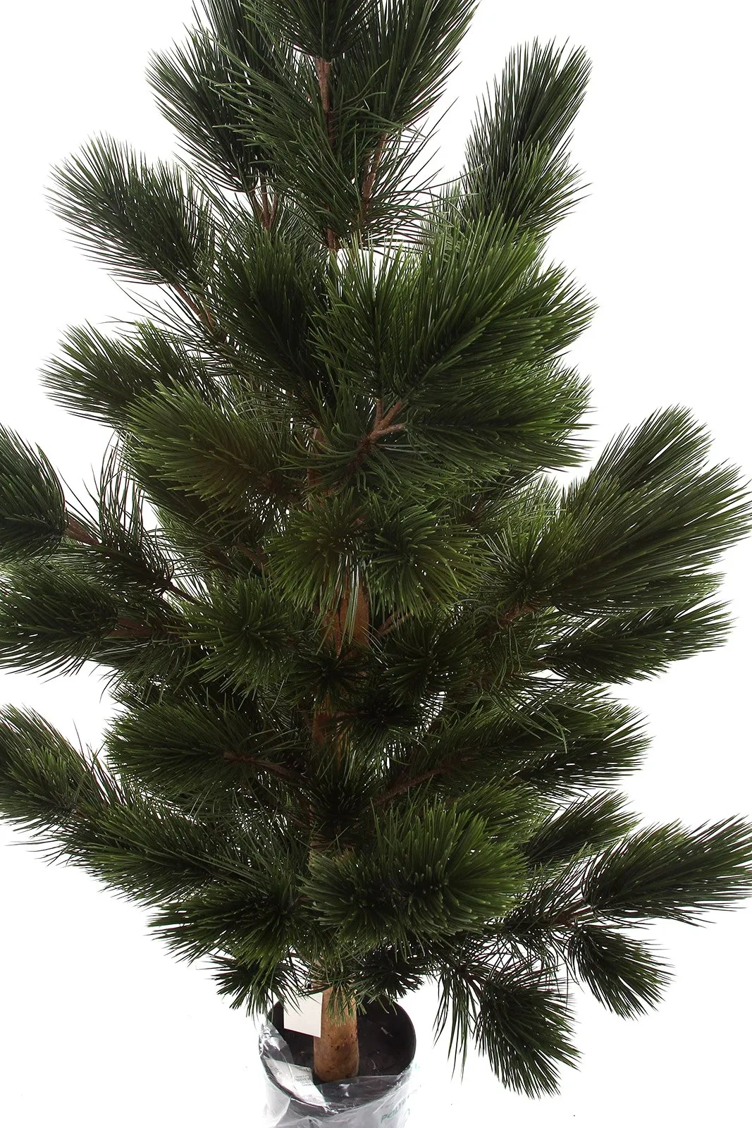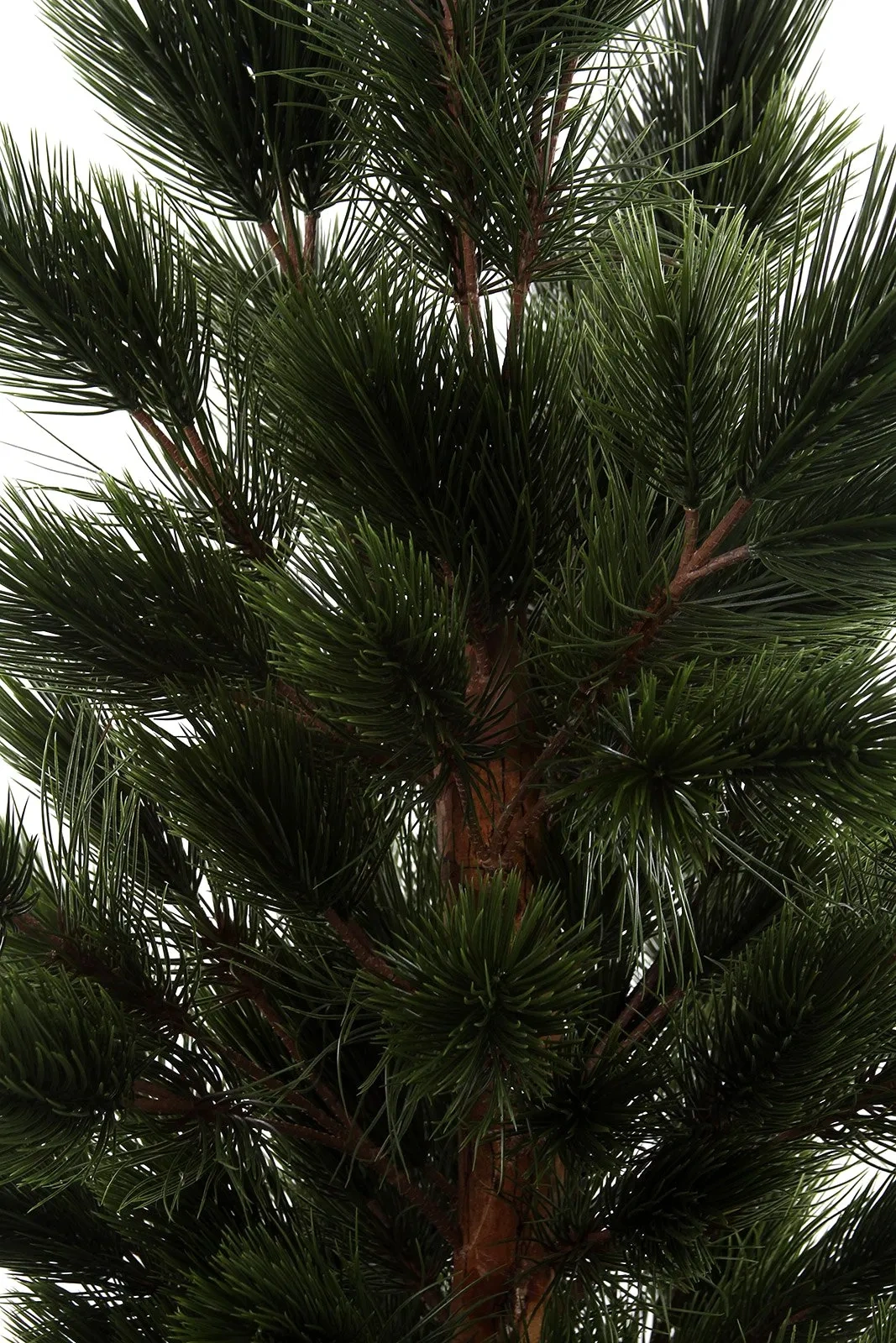 Kluczowym atutem jest drewniany naturalny pień. Jego chropowata faktura oraz cieniowana kolorystyka – przechodząca od głębokiego brązu po rudawe akcenty – nadają roślinie autentycznego charakteru, rzadko spotykanego w standardowych sztucznych drzewkach. Gałęzie są gęsto osadzone i wypełnione długimi, ciemnozielonymi igłami, które naturalnie układają się w pęki, tworząc efekt puszystości i głębi. Całość osadzona jest w stabilnej doniczce technicznej, gotowej do włożenia w ozdobną osłonkę.