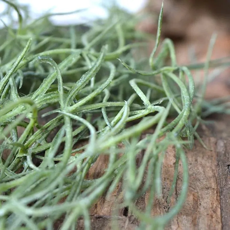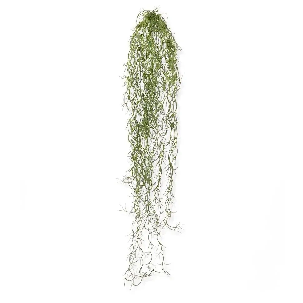 - Realistyczny wygląd: Sztuczna Tillandsia charakteryzuje się delikatnymi, długimi, zwisającymi pędami w odcieniu stonowanej zieleni, które do złudzenia przypominają naturalną roślinę. Bliskie ujęcie ukazuje drobne, zawiłe struktury na pędach, dodające autentyczności.