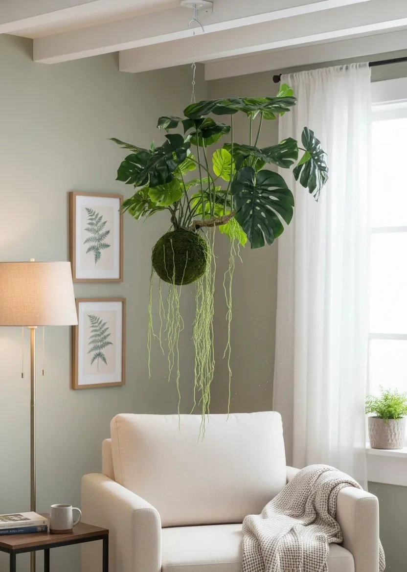Sztuczna monstera dziurawa (kokedama) wisząca, osadzona w kuli z mchu