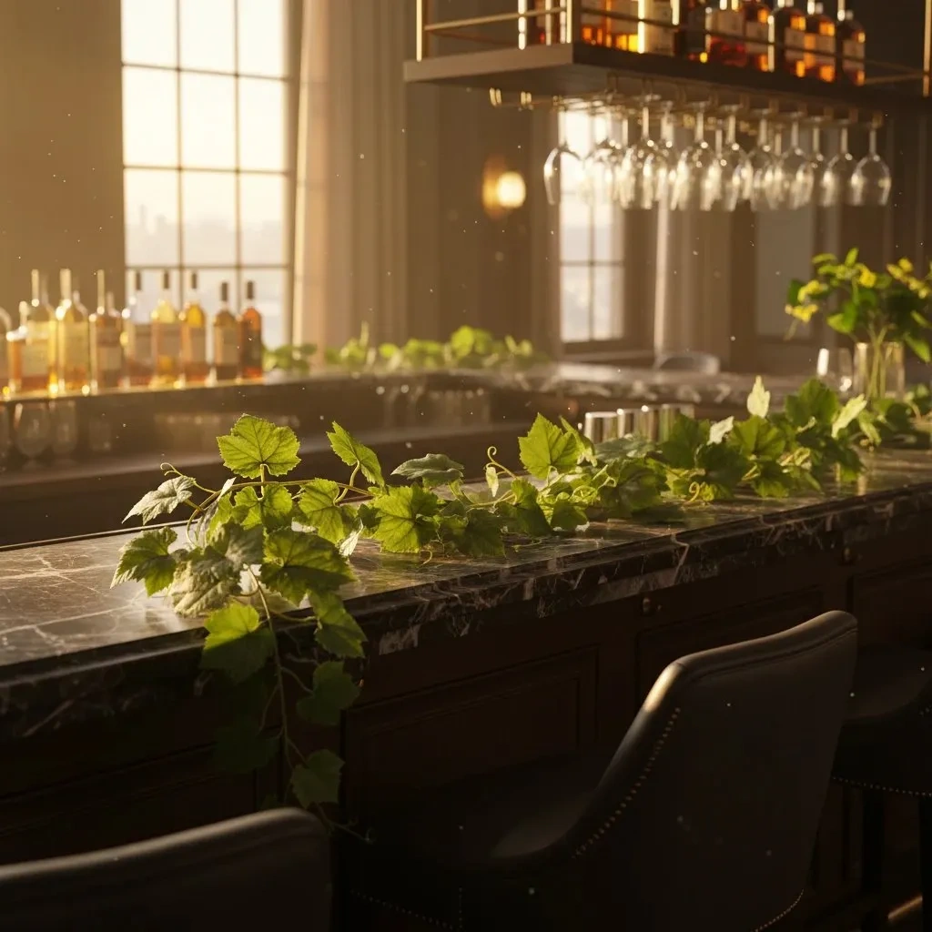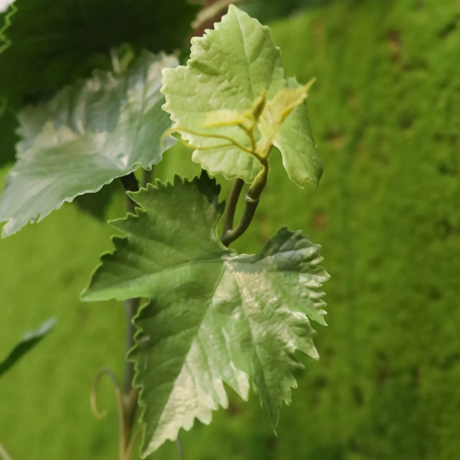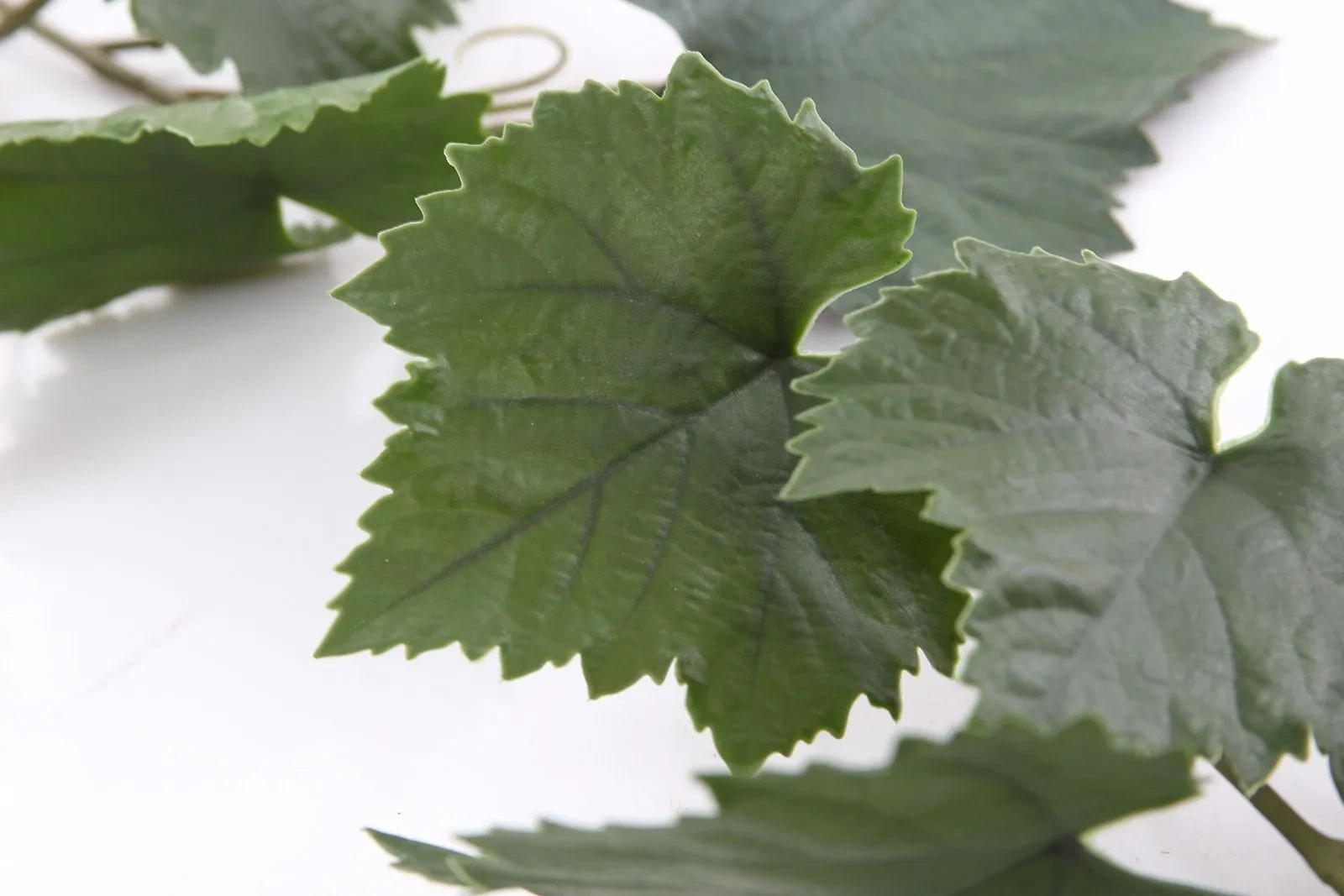Pnącze winogrona zostało zaprojektowane tak, aby do złudzenia przypominać naturalną roślinę. Detale takie jak stopniowanie wielkości liści – od większych u nasady po drobne, jasne listki na końcach pędów – sprawiają, że kompozycja nabiera głębi i dynamiki. Matowe wykończenie powierzchni liści eliminuje sztuczny połysk, co jest kluczowe dla uzyskania naturalnego efektu w mocnym oświetleniu.