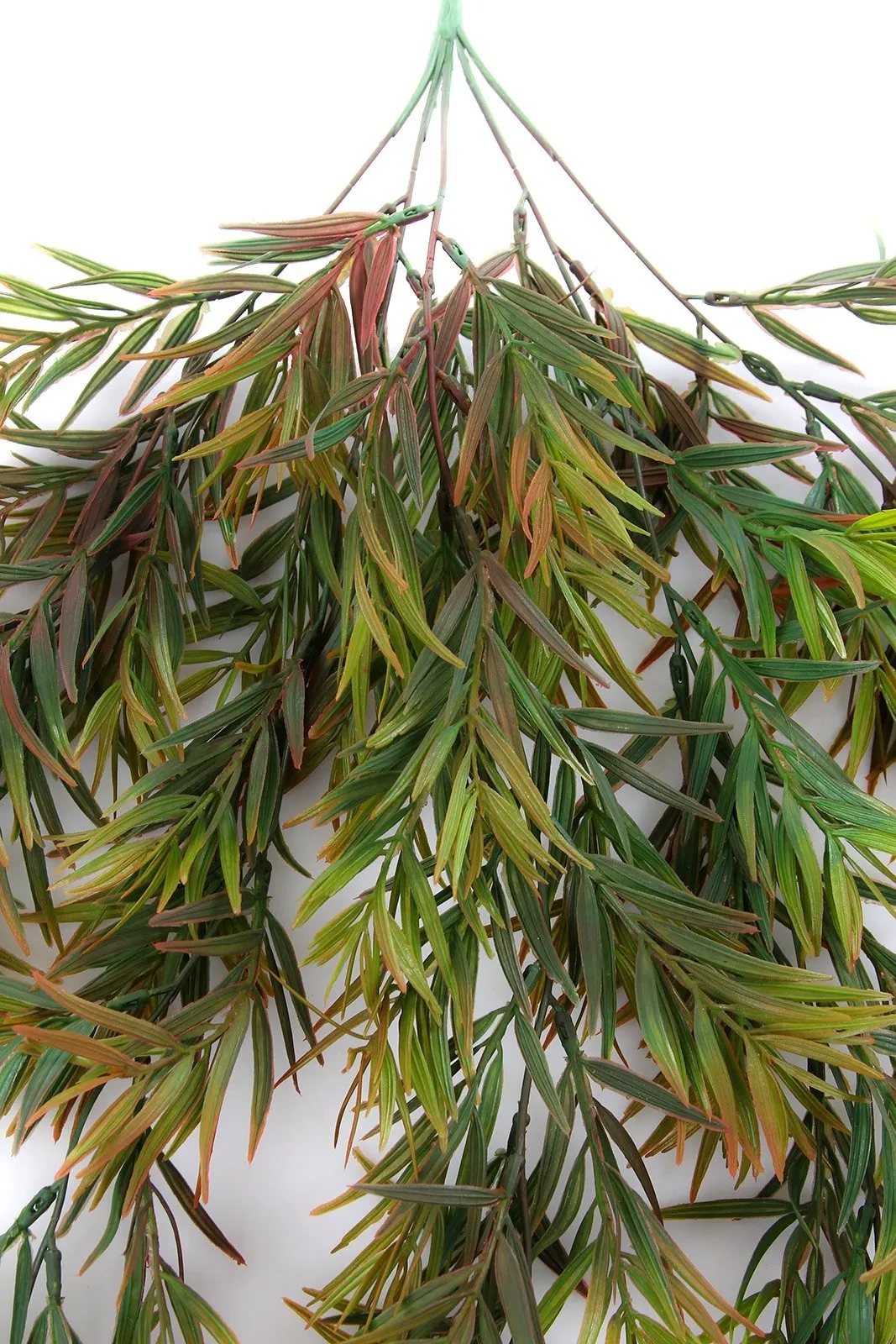 Długie, gęste gałązki ozdobione są mnóstwem drobnych, igiełkowych listków, które wiernie naśladują naturalną roślinę. Kolorystyka przechodzi od soczystej, ciemnej zieleni w środkowych partiach, do cieplejszych, rudo-czerwonych i pomarańczowo-brązowych akcentów na końcach pędów, co nadaje całości głębi i dynamicznego, jesienno-letniego wyglądu.