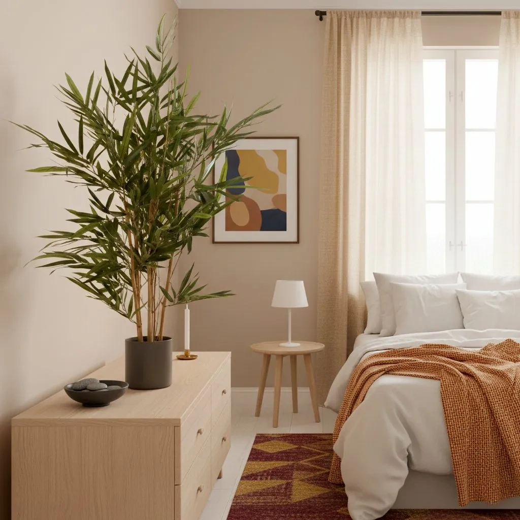- styl urban jungle: zestaw bambus z innymi sztucznymi palmami i paprociami w plecionych osłonkach, aby stworzyć zielony azyl w sypialni.