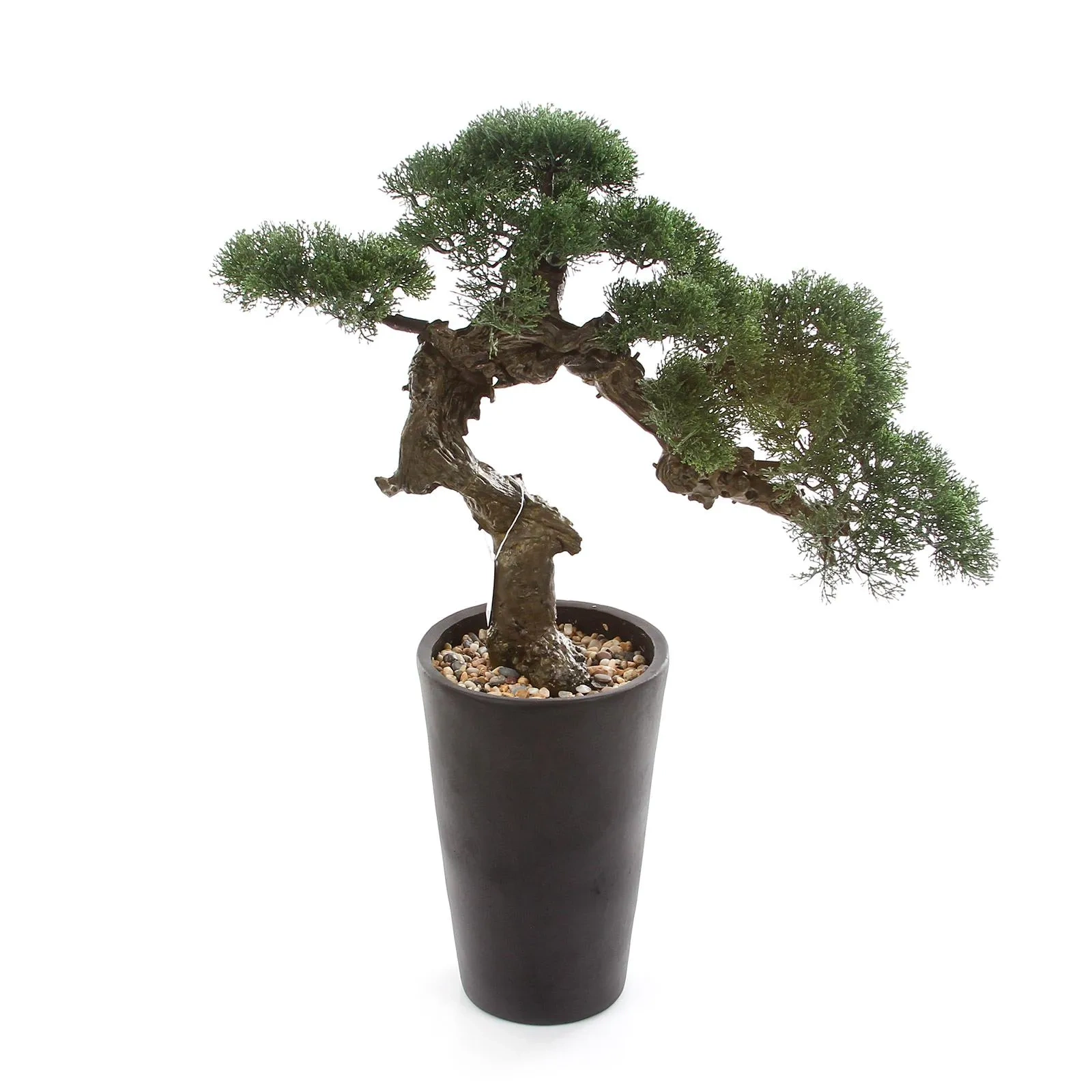Majestatyczny sztuczny Bonsai Cedr, charakteryzuje się niezwykle realistycznym, pofalowanym pniem o brązowym, sękatym wyglądzie, który oddaje strukturę prawdziwego drzewka bonsai. Jego gęste, iglaste gałązki w soczystym odcieniu zieleni, są precyzyjnie uformowane, tworząc rozłożystą i asymetryczną koronę, typową dla tradycyjnych form bonsai. Liście (igły) są drobne i gęsto osadzone, nadając całości bujny i naturalny wygląd. Roślina osadzona jest w eleganckiej, wysokiej, czarnej doniczce o matowym wykończeniu, która idealnie komponuje się z kolorem pnia i zielenią igieł. Powierzchnia doniczki wypełniona jest imitacją żwirku lub kamyków, co dodatkowo potęguje realizm kompozycji.