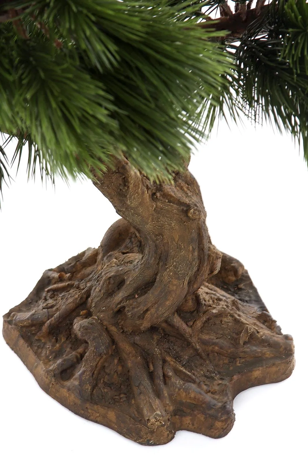 Bonsai ma gęste, intensywnie zielone igły, ułożone w charakterystyczne, puszyste kępy, doskonale imitują naturalne sosnowe igły, nadając roślinie autentyczny i świeży wygląd. To, co jednak naprawdę wyróżnia ten produkt, to naturalny, prawdziwy drewniany pień. Dzięki niemu, każde drzewko jest unikatowe, a jego solidna, brązowa struktura z wyraźną fakturą wiernie oddaje autentyczność prawdziwego drzewa bonsai, z widocznym systemem korzeniowym u podstawy. Delikatne wygięcie pnia dodaje mu artystycznego charakteru i dynamiki. Co więcej, igły i liście zostały wyposażone w powłokę UV, która chroni je przed blaknięciem pod wpływem promieni słonecznych. Podstawa, misternie imitująca ziemię i splątane korzenie, zapewnia stabilność i dopełnia realistyczny efekt, sprawiając, że roślina prezentuje się niezwykle przekonująco.