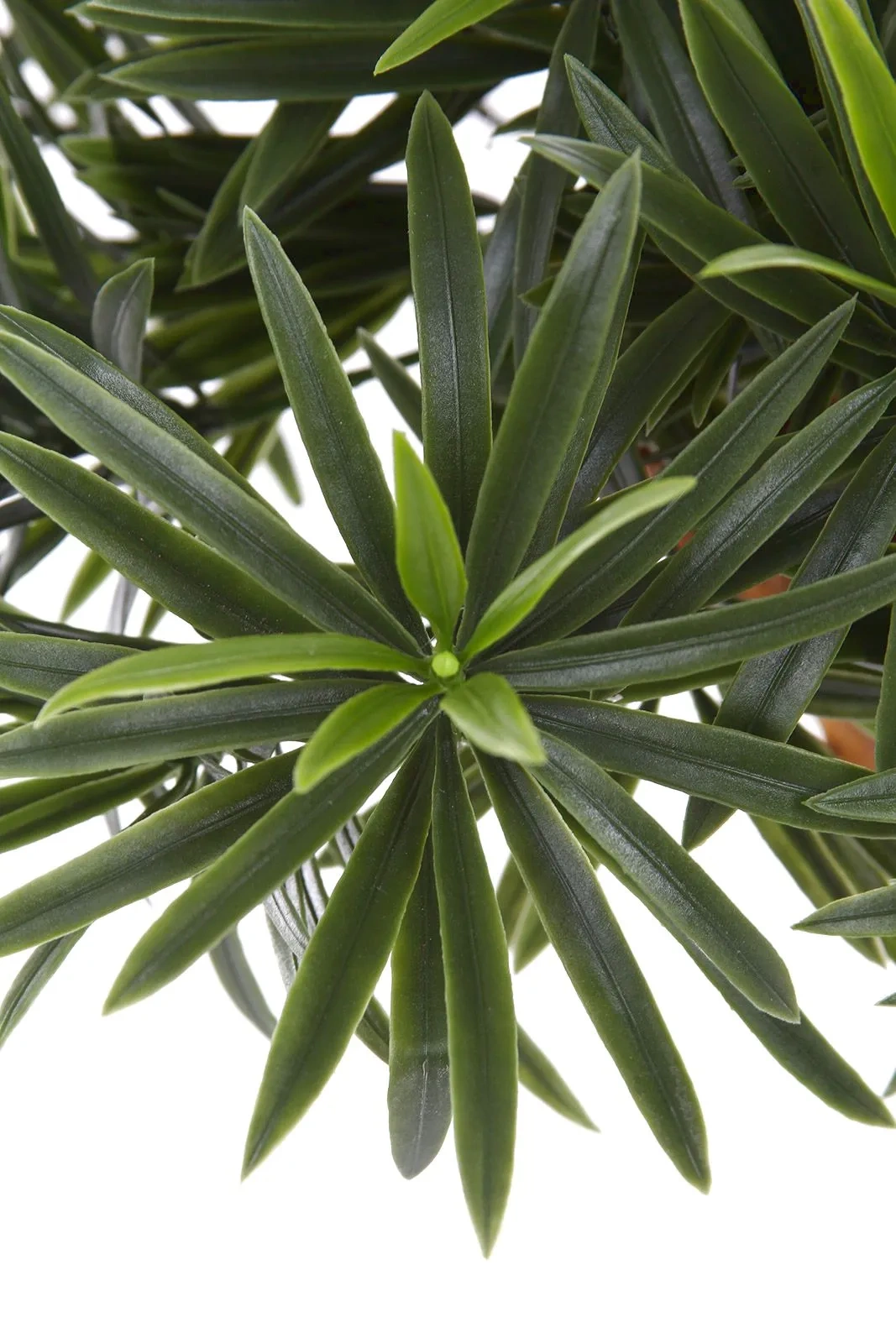 - wysoka jakość liści: gęste, intensywnie zielone, wąskie liście układają się w rozetki na końcach pędów, idealnie imitując naturalny wygląd Podocarpus (znany również jako Nageia nagi). Bliski kadr liści ukazuje ich soczystą barwę i realistyczną fakturę.