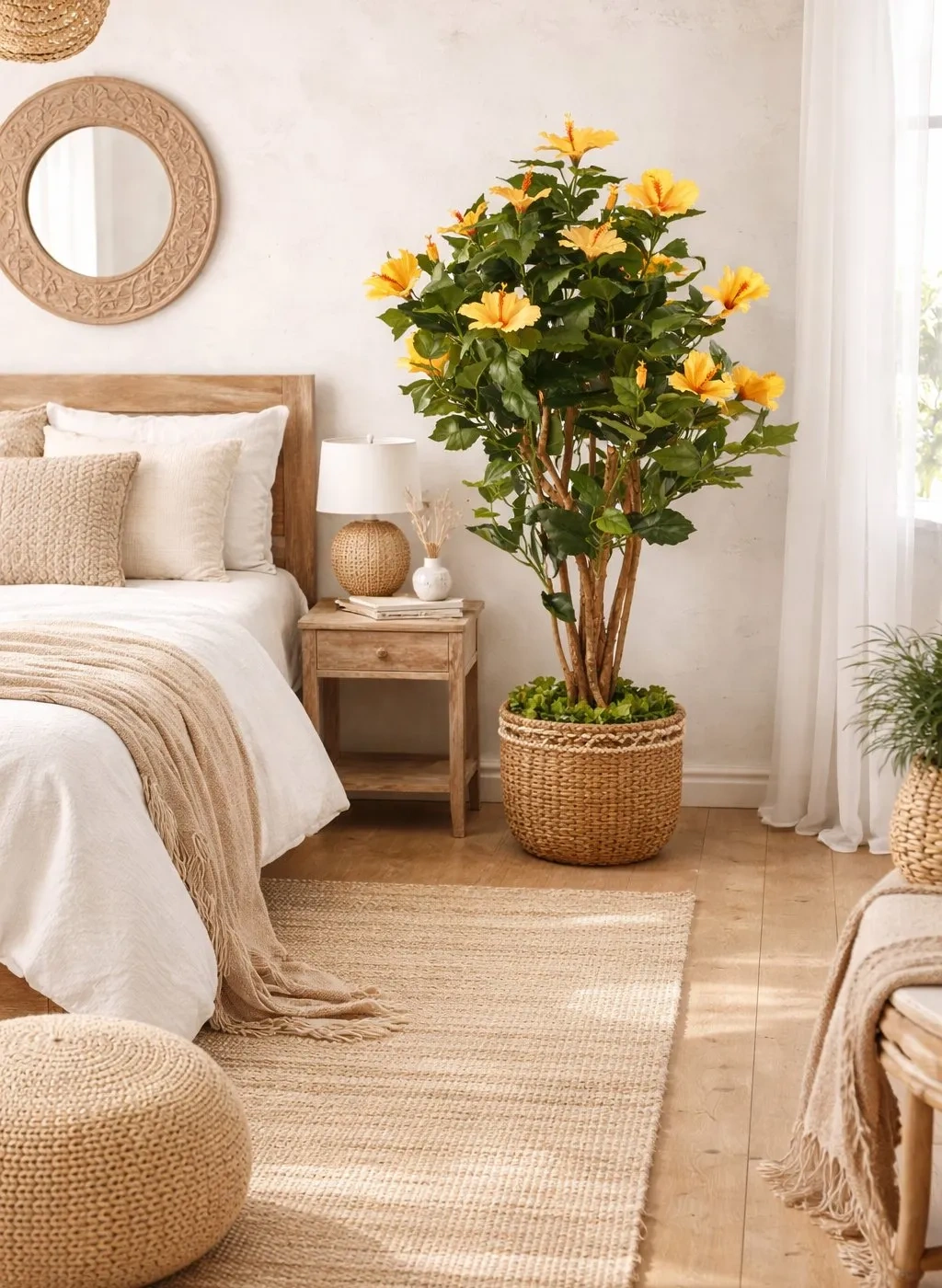 Sztuczny Hibiskus 100 z pomarańczowymi kwiatami w sypialni