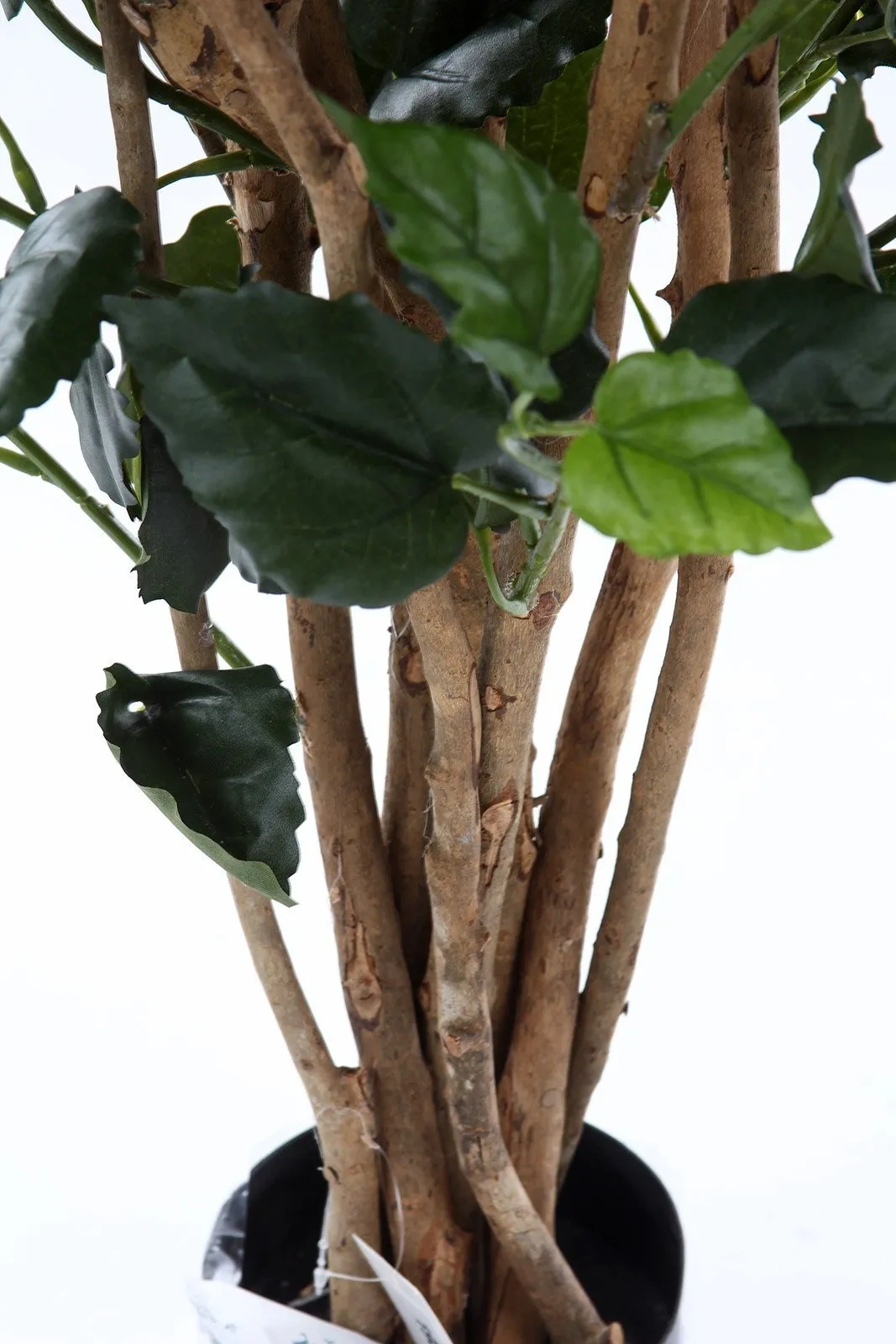 Tym, co definiuje wersję "deluxe" i odróżnia ją od standardowych sztucznych roślin, jest jej konstrukcja nośna. Hibiskus nie posiada jednolitej, plastikowej łodygi, lecz osadzony jest na kilku naturalnych, drewnianych pniach. Autentyczna, chropowata faktura kory, naturalne przebarwienia i nieregularne kształty gałęzi sprawiają, że roślina wygląda niezwykle szlachetnie i jest trudna do odróżnienia od żywego okazu nawet z bliskiej odległości. To element, który wnosi do wnętrza prawdziwą naturę.