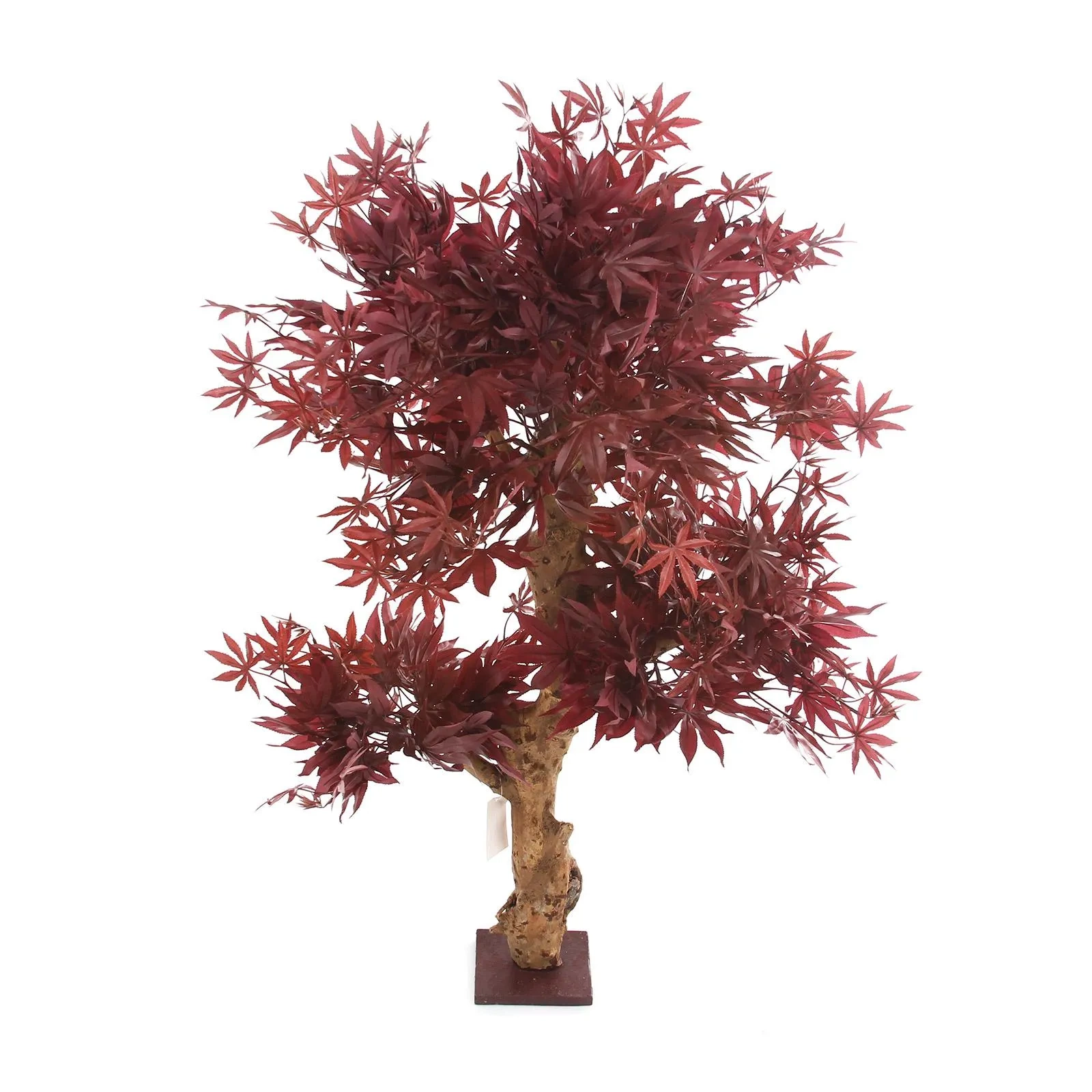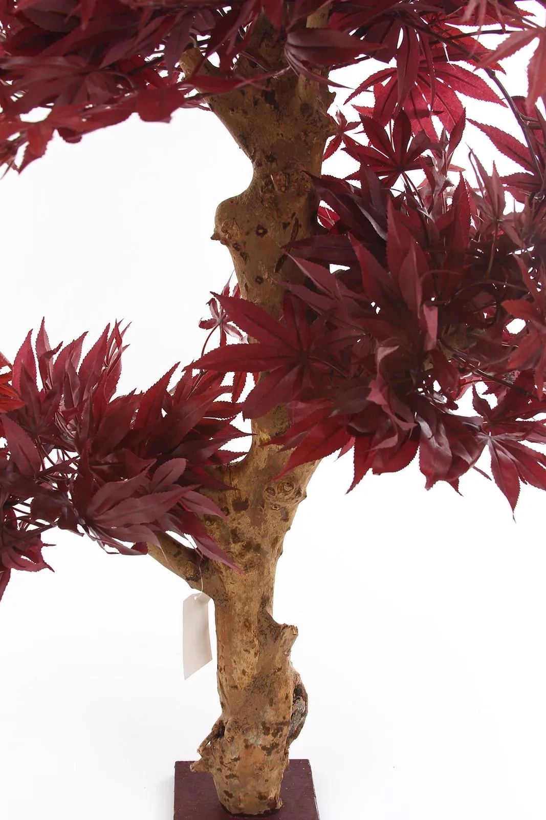 Drzewko wyróżnia się rozgałęzionym naturalnym drewnianym pniem. To, co jednak najbardziej przyciąga wzrok, to jego bujne liście w zachwycającym odcieniu głębokiego burgundu. Każdy liść jest precyzyjnie odwzorowany, z charakterystycznymi dla klonu wcięciami i delikatnymi detalami, co sprawia, że cała roślina prezentuje się niezwykle autentycznie i luksusowo. Różne odcienie burgundu na liściach, od jaśniejszych po ciemniejsze, dodają im głębi i dynamiki. Całość osadzona jest na stabilnej, ciemnej podstawie, która harmonijnie dopełnia kompozycję i zapewnia estetyczne wykończenie. Wysokość 95 cm czyni to bonsai wyraźnym, ale jednocześnie subtelnym elementem dekoracyjnym, idealnym do umieszczenia na podłodze, komodzie czy większej półce.