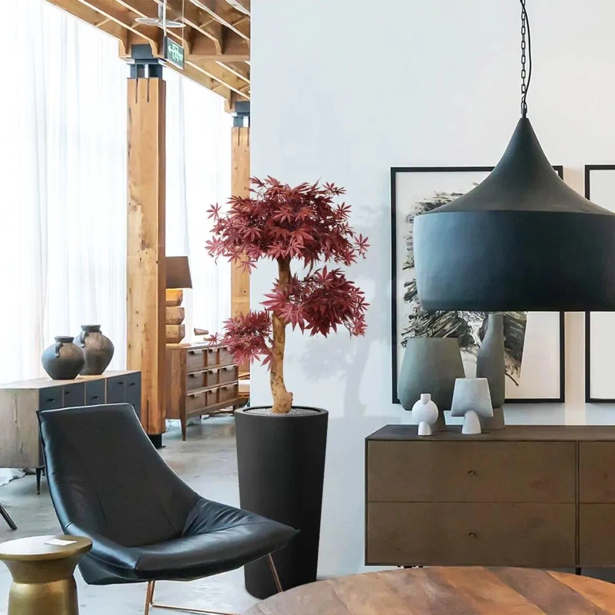 - Loftowe przestrzenie: obok ceglanych ścian, metalowych elementów i surowych wykończeń, burgundowy bonsai doda ciepła i elegancji, przełamując industrialny charakter.