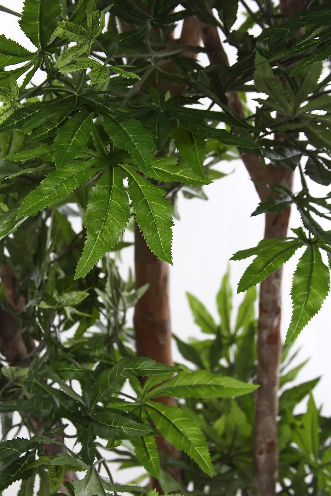 Sztuczny klon japoński bonsai został stworzony z dbałością o najdrobniejsze szczegóły, aby jak najwierniej oddać naturalny wygląd żywej rośliny. Pnie drzewa są naturalne, drewniane. Rozłożyste, zielone liście, z wyraźnie zaznaczonymi nerwami i ząbkowanymi brzegami, perfekcyjnie odwzorowują kształt liści klonu japońskiego, tworząc gęstą i bujną koronę. Wysokiej jakości materiały użyte do produkcji gwarantują trwałość i odporność na blaknięcie, dzięki czemu Twój klon będzie cieszył oko przez wiele lat.