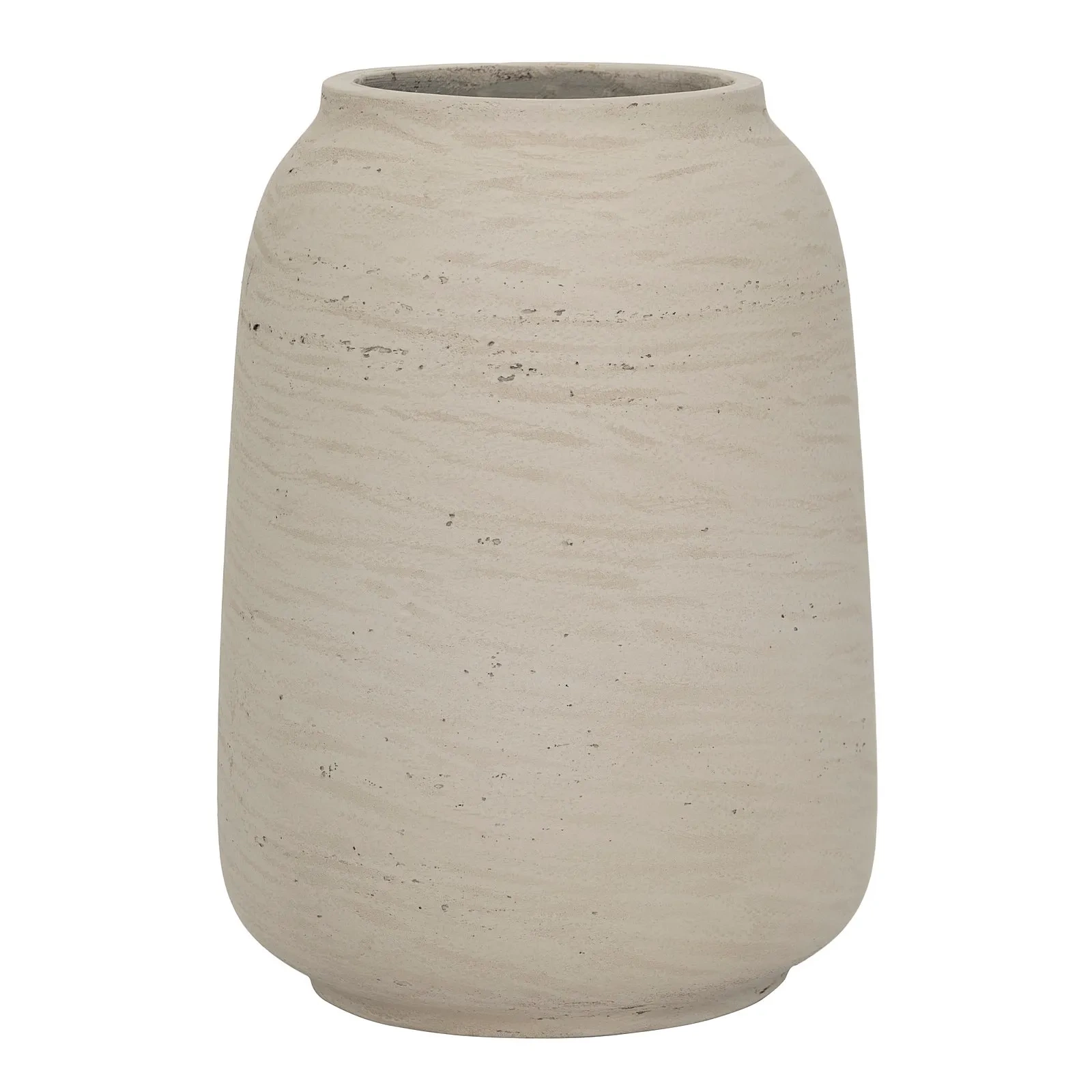 - Design: wazon ma prostą, cylindryczną formę z zaokrągloną podstawą, która subtelnie zwęża się ku górze. Jego powierzchnia jest porowata i ma delikatne, nieregularne wzory, które imitują naturalne formy skał lub osadów. Jasnoszary kolor podkreśla jego surowy i naturalny charakter, wpisując się idealnie w estetykę wabi-sabi.