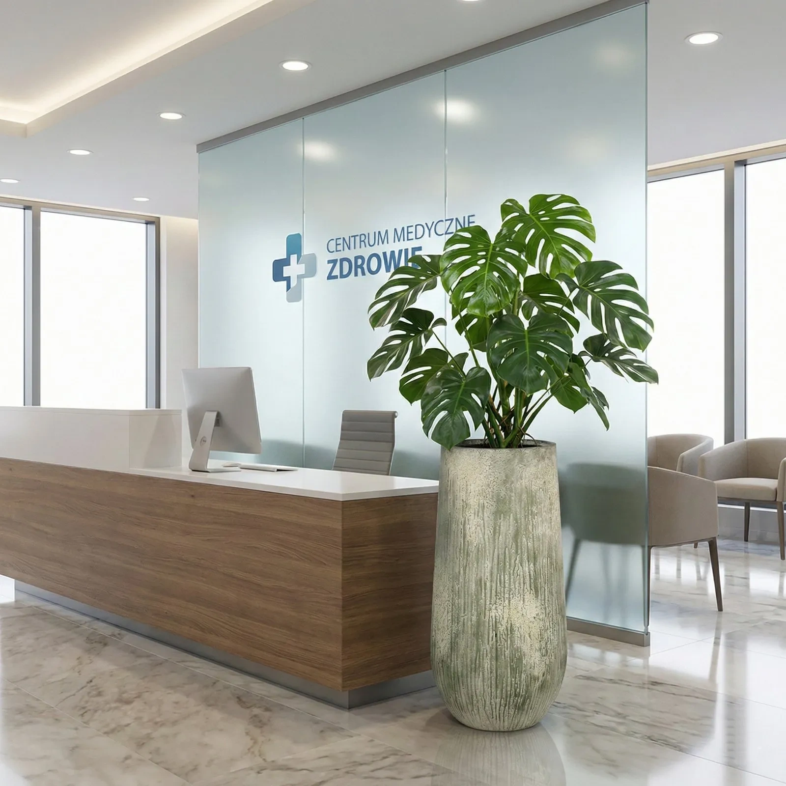 wysoka kamienna donica z rozłożystą monsterą w recepcji firmy