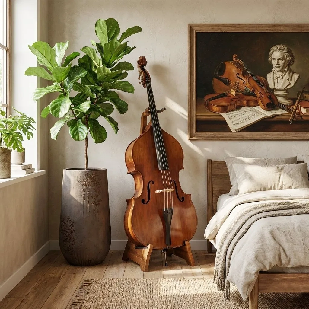 wysoka brązowa donica w sypialni z fikusem debolistnym