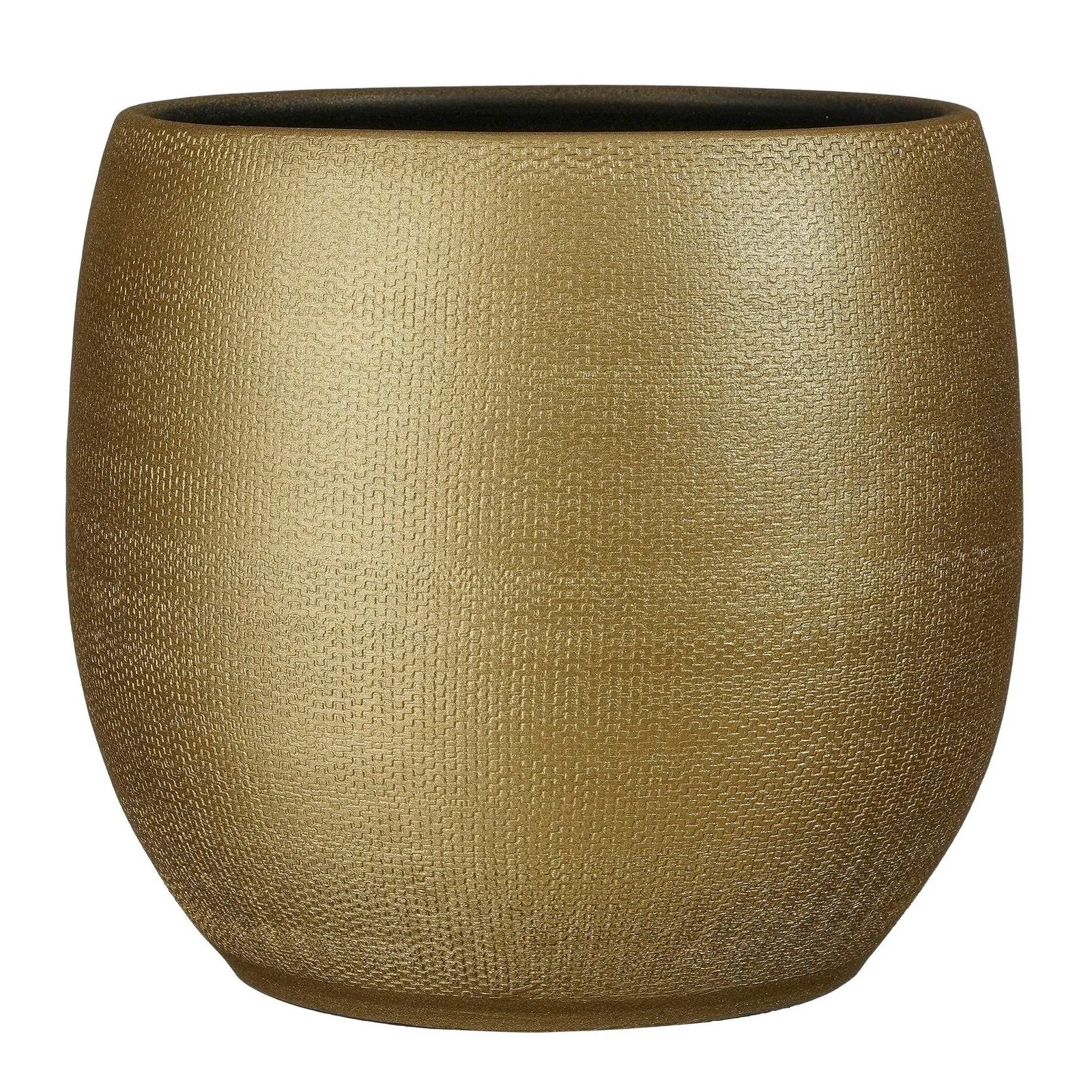 Wykonana z wysokiej jakości ceramiki, osłonka Porto charakteryzuje się matowym, lecz delikatnie połyskującym wykończeniem. Jej powierzchnia jest bogato teksturowana, co nadaje jej trójwymiarowy, niemal aksamitny wygląd, przypominający misternie tkany materiał lub drobne, nieregularne nacięcia. Ta unikalna faktura dodaje głębi i sprawia, że osłonka jest niezwykle przyjemna w dotyku i interesująca wizualnie. Jej kulisty, zaokrąglony kształt zwęża się ku górze, tworząc eleganckie, szerokie ujście, które idealnie pomieści różnorodne rośliny.